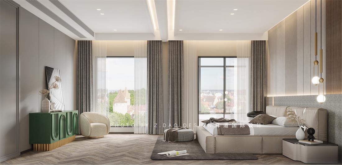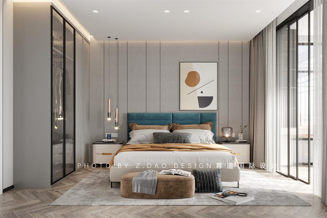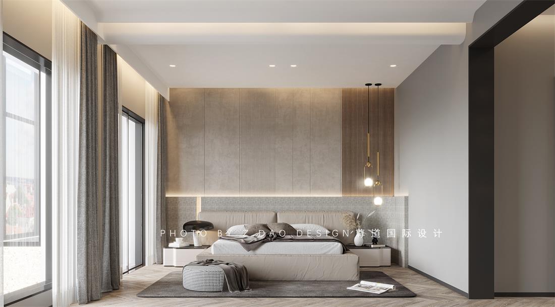 主卧床背与床一体化设计,空间关系更加完整,隐藏灯带的设置,运用光与影营造温馨与时尚氛围。床头灯具以高低错落的组合形式打破常规,提升层次。床头的背景有设计弧度的造型,加上竖向的硬包和长城板,有层次,有立体感。