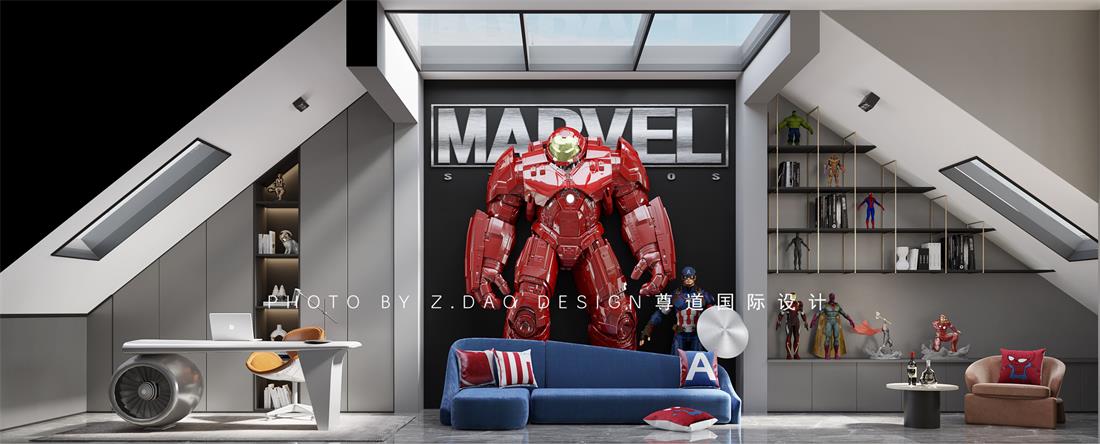 四层是给孩子玩耍的空间,也是主人在这边办公的一个地方,阁楼的两面斜顶,我们没有吊顶破坏,利用斜面做了整面的柜子作为储物和展示,金属的吊架也是给小朋友方玩具的地方,也是小朋友读书,看书的地方。天窗的位置我们做了一个家庭区,这是一家人在这边聊天,看星星的位置,钢铁侠的美队的植入,是空间的亮点,墙面的墙绘更是整体空间的氛围表达。