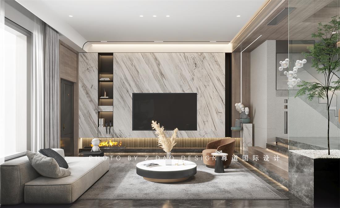 电视墙利用入户门垛的深度,设计了背景墙柜,选用了云石板作为门板,起到装饰以及储物,比例划分做了面的切割,做到黄金比例,沙发后面运用格栅板以及硬包做空间的装饰,软装上择取含蓄内敛的古铜、高贵典雅的石材、光泽细腻的皮革,配以无处不有的温润气息,以期呈现集品质、艺术、舒适为一体的精妙生活方式。