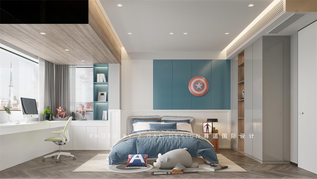 儿童房空间外拓加大了室内的面积,但是在设计之初就有外拓的梁体太低导致设计上的问题,所以在空间划分上我们做了区域分割,并且在吊顶上解决区域问题,床体避开梁体,整体颜色运用蓝色系,利用窗台做书桌,加上书架,这是一个使用且美观的空间。
