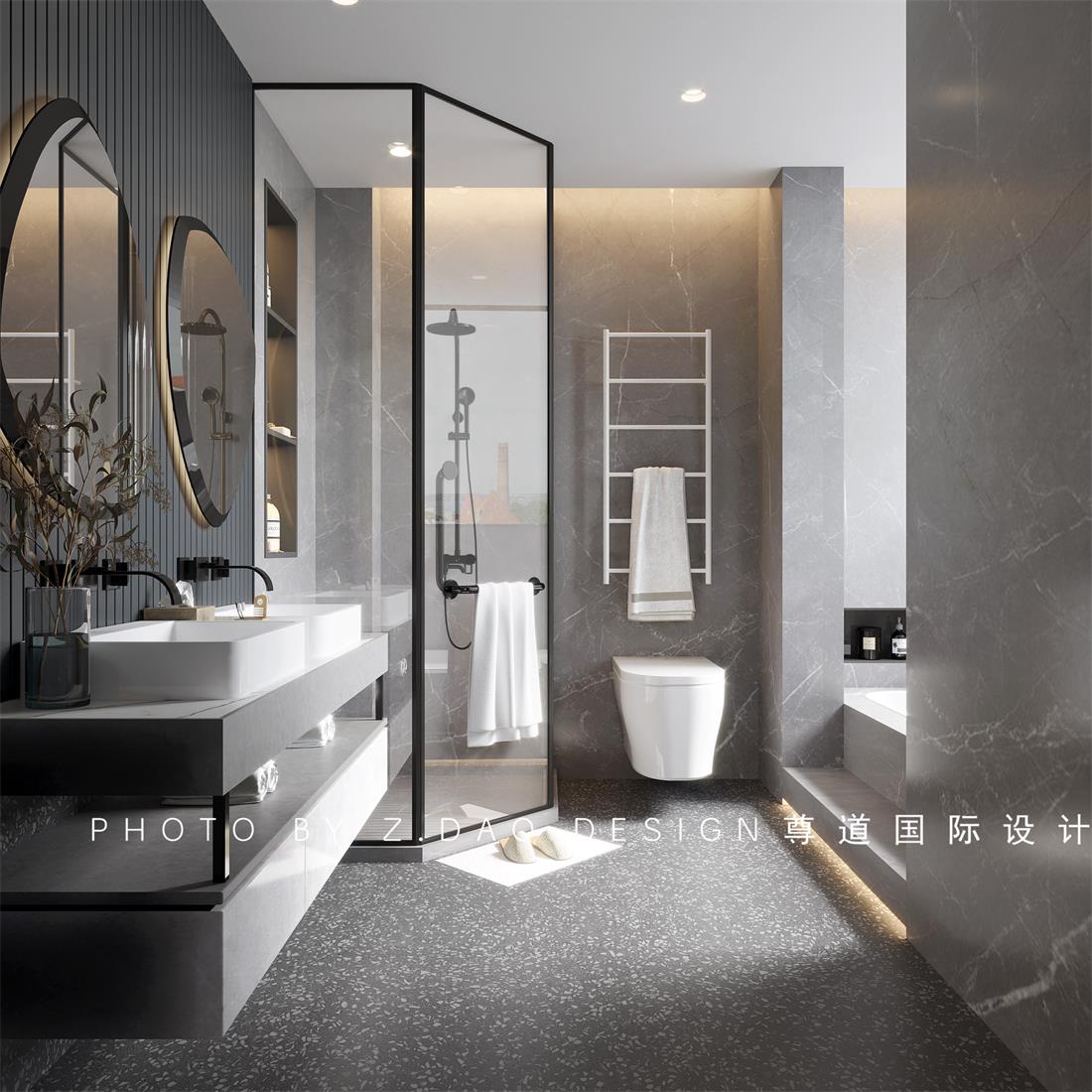 卫生间延续了主卧室套房的色调,所以了深色的空间,深色的设计在品质上可能会高于浅色系,让人觉得更有品质和档次感。