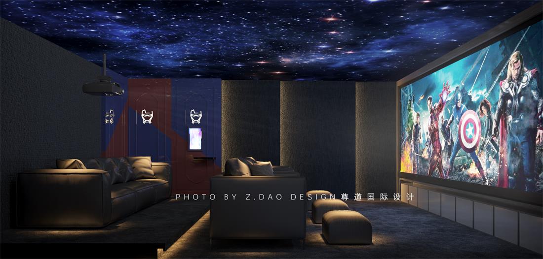 影音室的面积是足够大的,空间上我们做了双区域,设计了地台,加上灯带,顶面全部用了星空顶,墙面的叠加造型加上了钢铁侠的元素,这样的观影空间怎么能不炫酷呢。