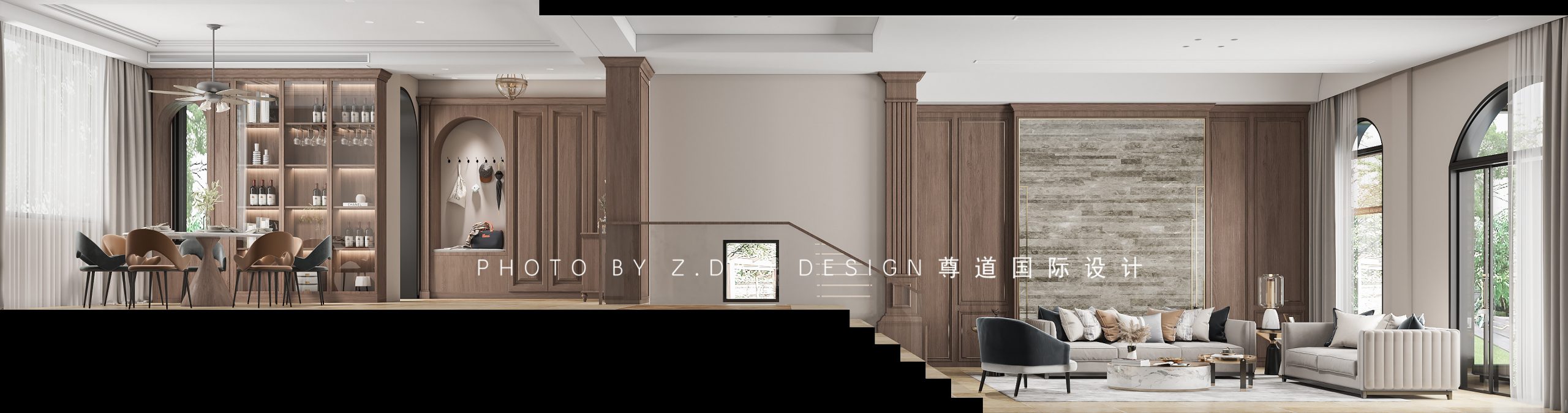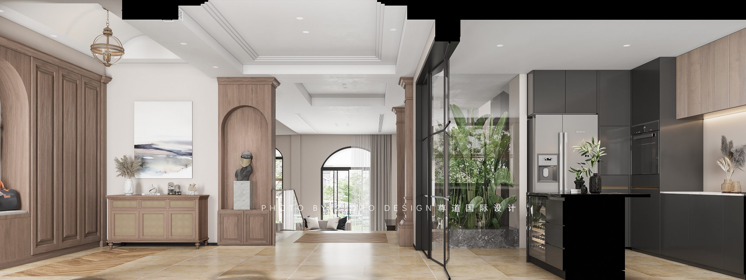 一层休闲美式,入户区穹形顶,增加视觉层高的同时让看见空间的第一眼就充满了仪式感。地砖和木地板拼接,木饰面与艺术涂料结合,透明玻璃里的绿植,这个家,复古又休闲。