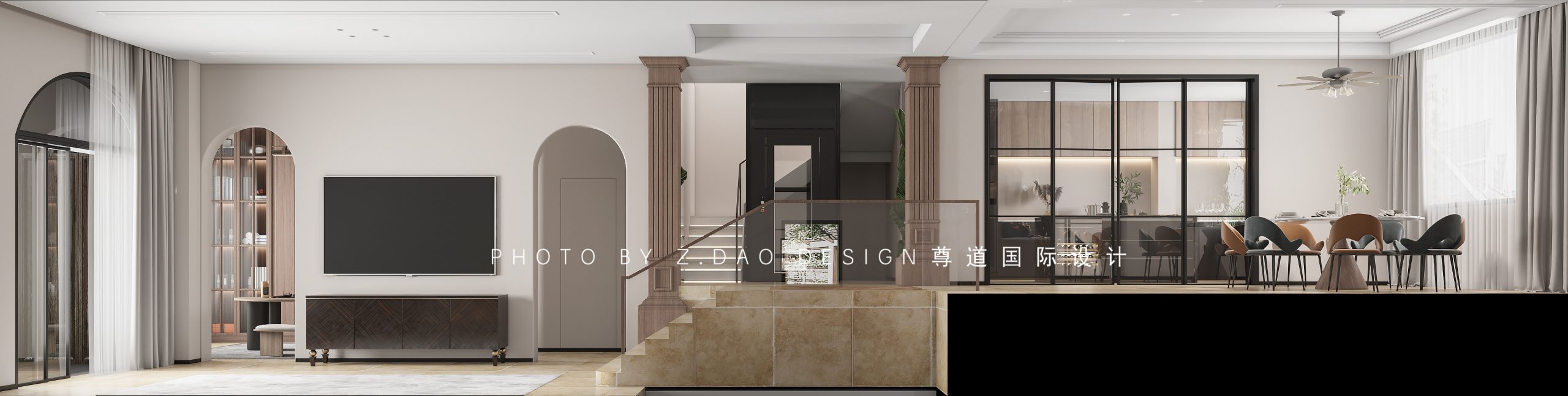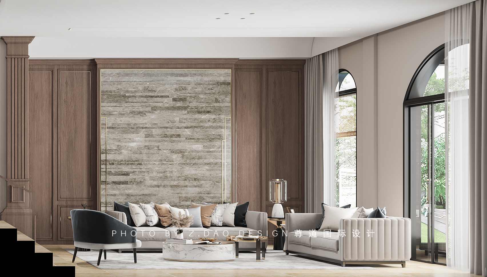 在客厅原始层高较高处做了弧形顶处理,保留了较高的层高,原始承重柱做成罗马柱,封掉原始壁炉及其旁边的窗户,沙发背景墙岩板和护墙板结合,岩板区域突出墙面,使得造型墙有了空间层次感。