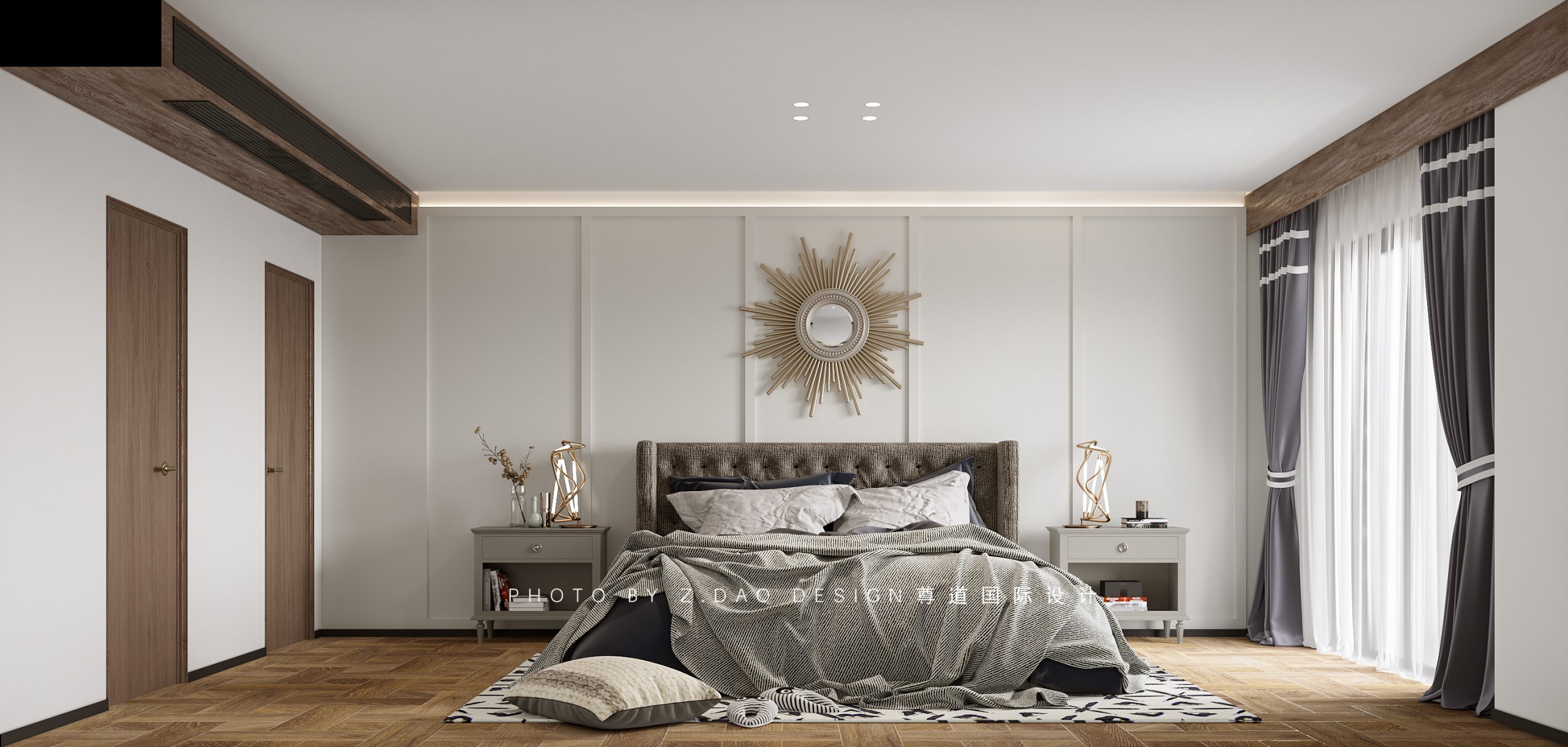父母房我们想要它简单又沉稳。背景墙造型打底点缀着美式挂件,无主灯的设计加入灯带显得空间更为简洁和层次感,风口吊顶和窗帘盒使用了了木饰面,避免过于简单而无趣。拼花地板、同色系的软装和柔软的地毯,温暖的风带起轻柔的白纱,美好的一天。