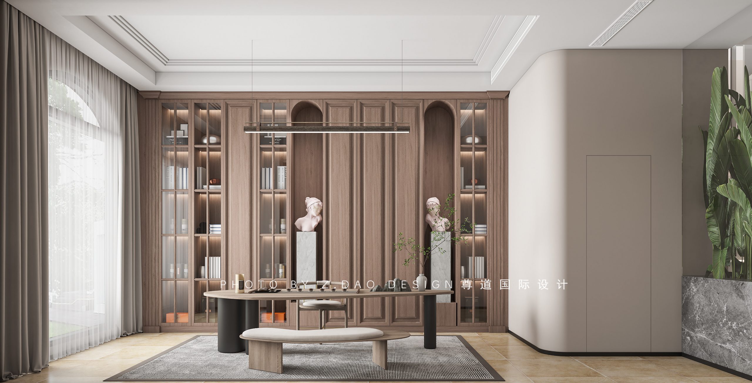一整面的书柜开放格和密闭柜结合,加入弧形元素,满足多样。在一个休闲的午后,品一壶茶,看一本书,温暖的阳关照射进来,享受安静舒适的午后,进入书的世界。值得一提的是,书房和过道以及厨房相连的墙体我们取消做成了绿植,空间变得活泼通透,可以在厨房忙碌的同时看见客厅的情况,在书房可以看见过道区域,增加视线上的穿插。