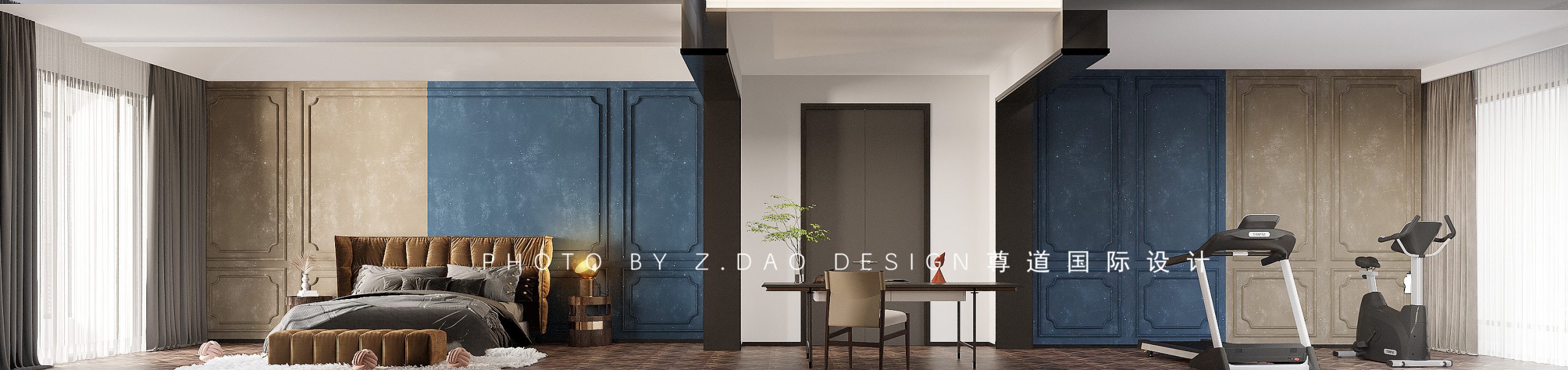 三层主卧与其他空间的沉稳不同是以米色和蓝色为主导的色彩呈现,推开主卧门入眼便是开放式书房,米色的书柜和整体色调统一,北边睡床区利用异型高低做了穹形顶,床尾做了造型墙,突出原始墙体,增加空间感的同时,跳色的加入使这个空间更为年轻活泼。