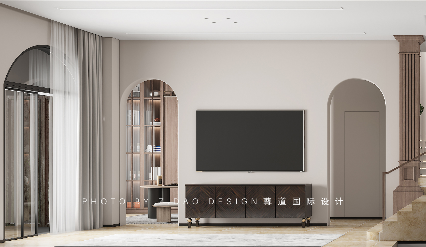 电视背景墙没有做过多的造型,去繁从简,只涂了艺术涂料,两个弧形门使茶室变成双动线的同时也点缀了客厅空间。