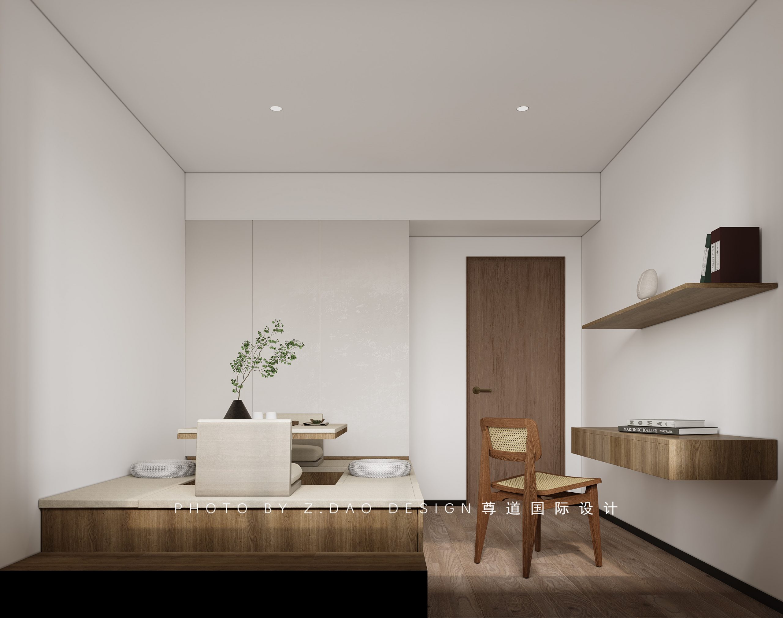 榻榻米区域依然是简洁的风格,温暖的木色配上白色,简单干净,榻榻米和飘窗台之间做了一个地台,增加空间趣味。平时这个空间作为书房使用,来客人了也可以作为客房,一屋多用。