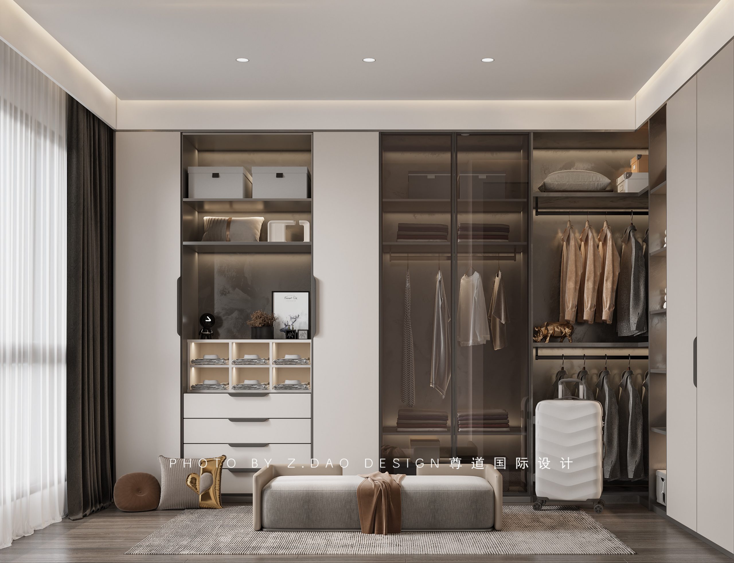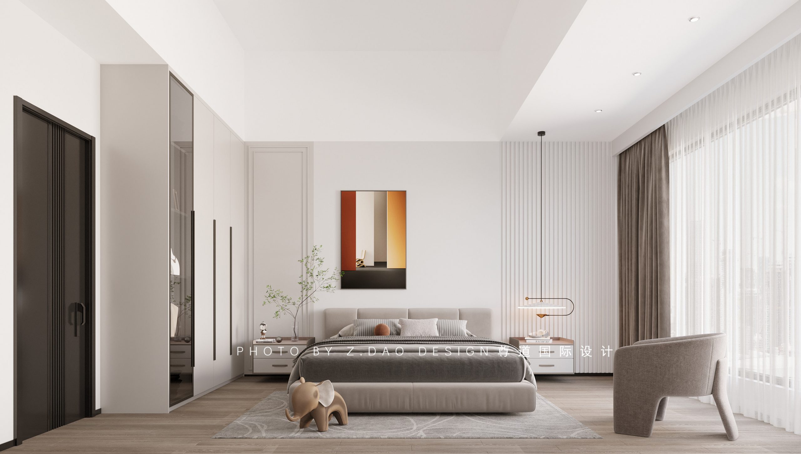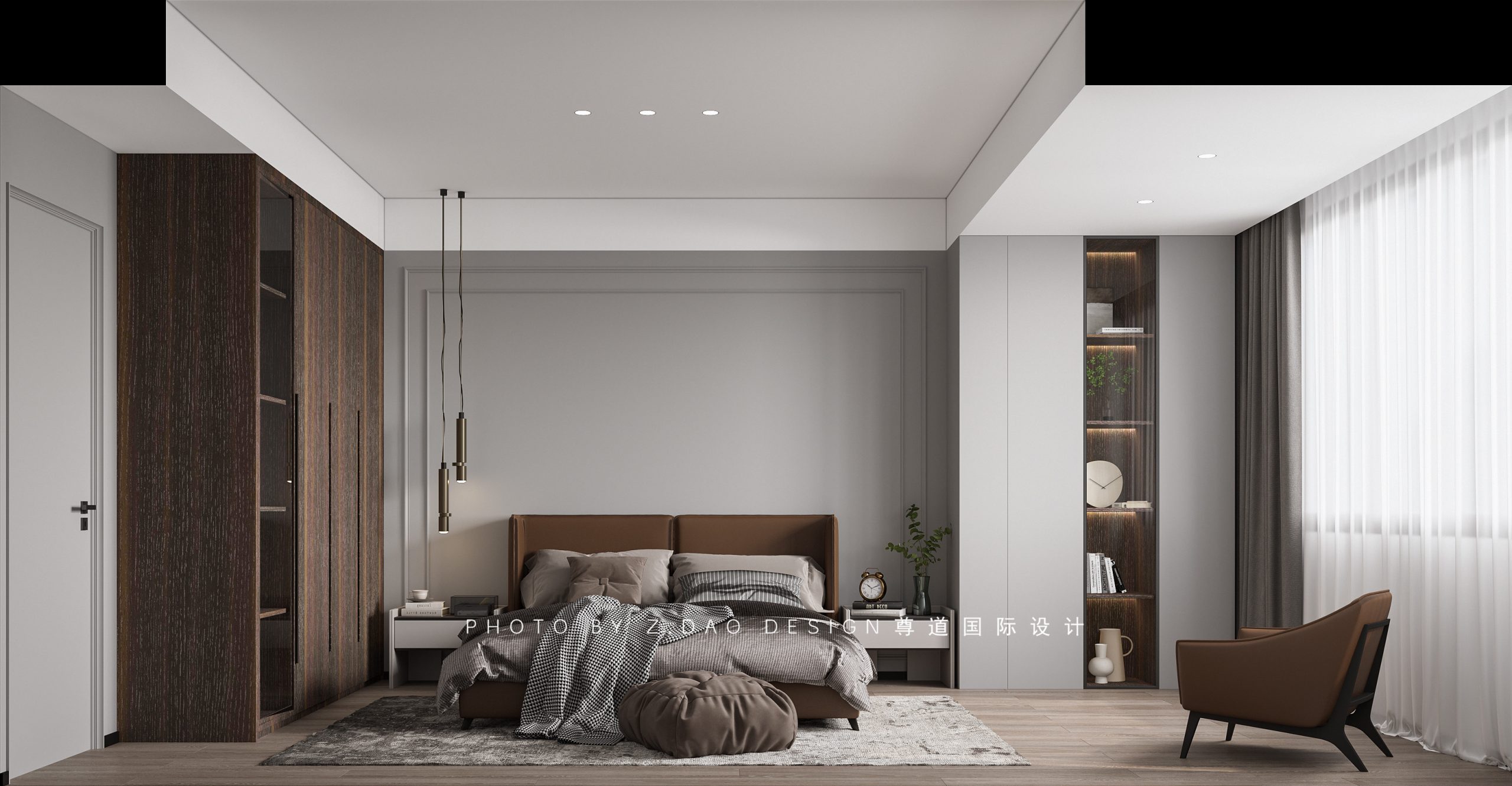 客卧为现代风,灰色为空间的主色调,床头背景PU线条加以吊灯点缀,睡床区吊顶上抬,避免层高过低的同时,空间有了落差感,木色的加入中和了灰色的冷静,变得温暖有理智。