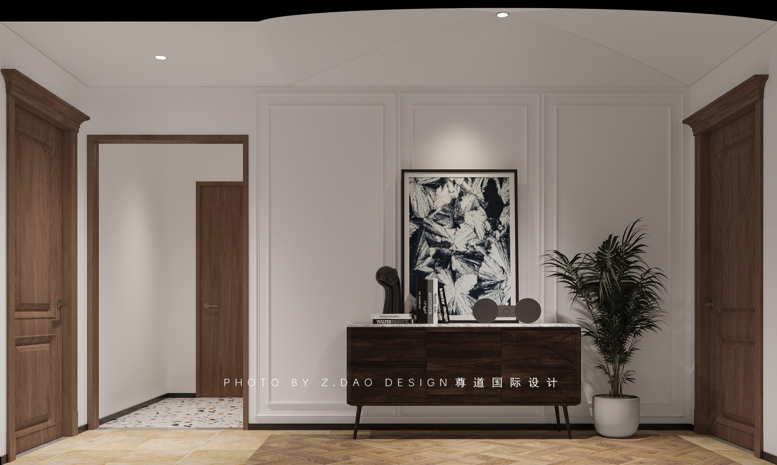 二层主要是父母居住所以过道区域穹形吊顶显得更为庄重,同时地面地砖和木地板拼接,墙面艺术涂料加PU线条。一株绿植的加入,点睛之笔。