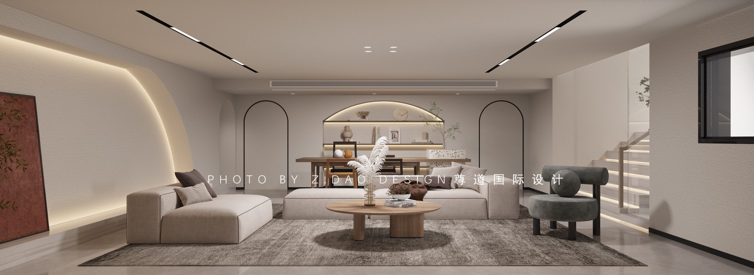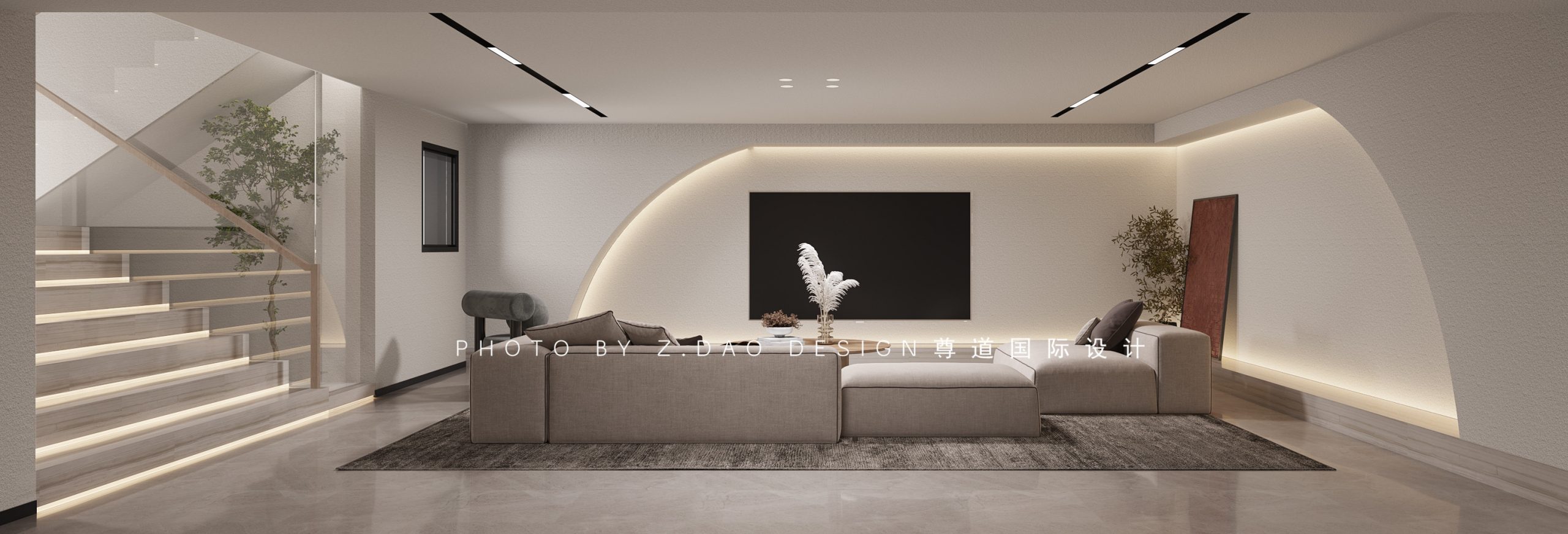 负一层我们打造了一个侘寂风的休闲空间,圆弧元素在这里随处可见,整个墙面全部艺术涂料,打造一个精致而放松的空间。无主灯设计让空间更加统一,休闲区做了一个不规则的对称造型,暗藏灯带,下面的地台和楼梯一个材质,用大理石做了墙面的材质分割,同时有了视觉的延伸,增加空间感。