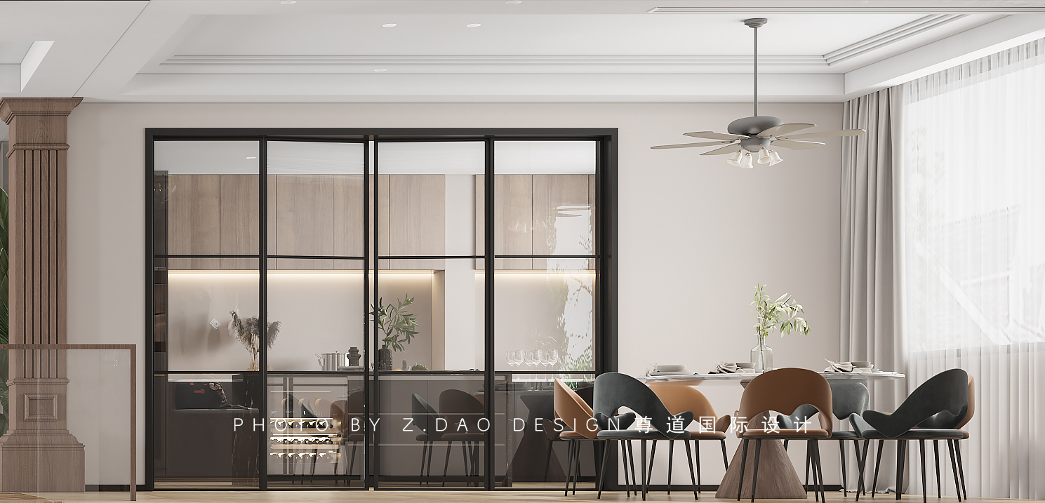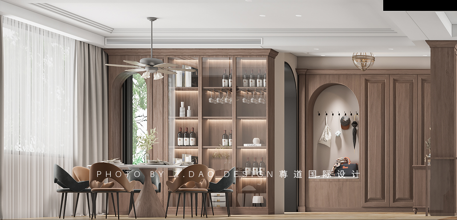 餐厅空间为叠级吊顶,主灯选用了风扇灯,餐边柜将窗户位留出,做了造型,加入了罗马柱元素,保持空间风格的统一。