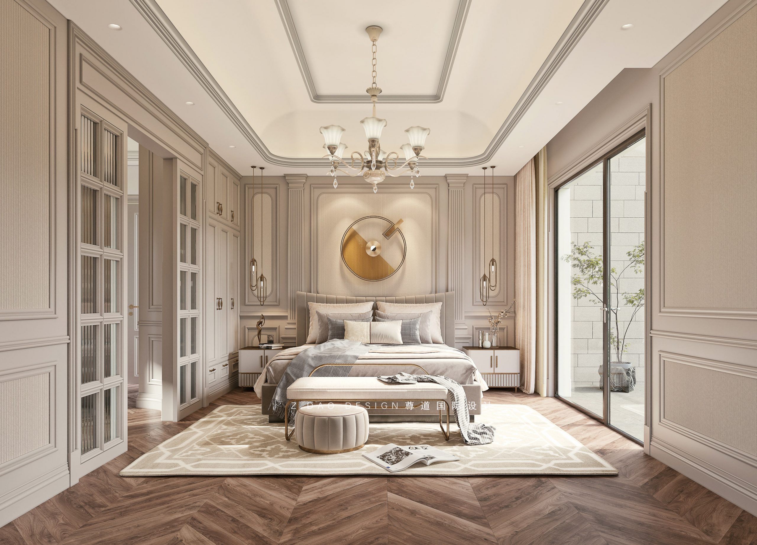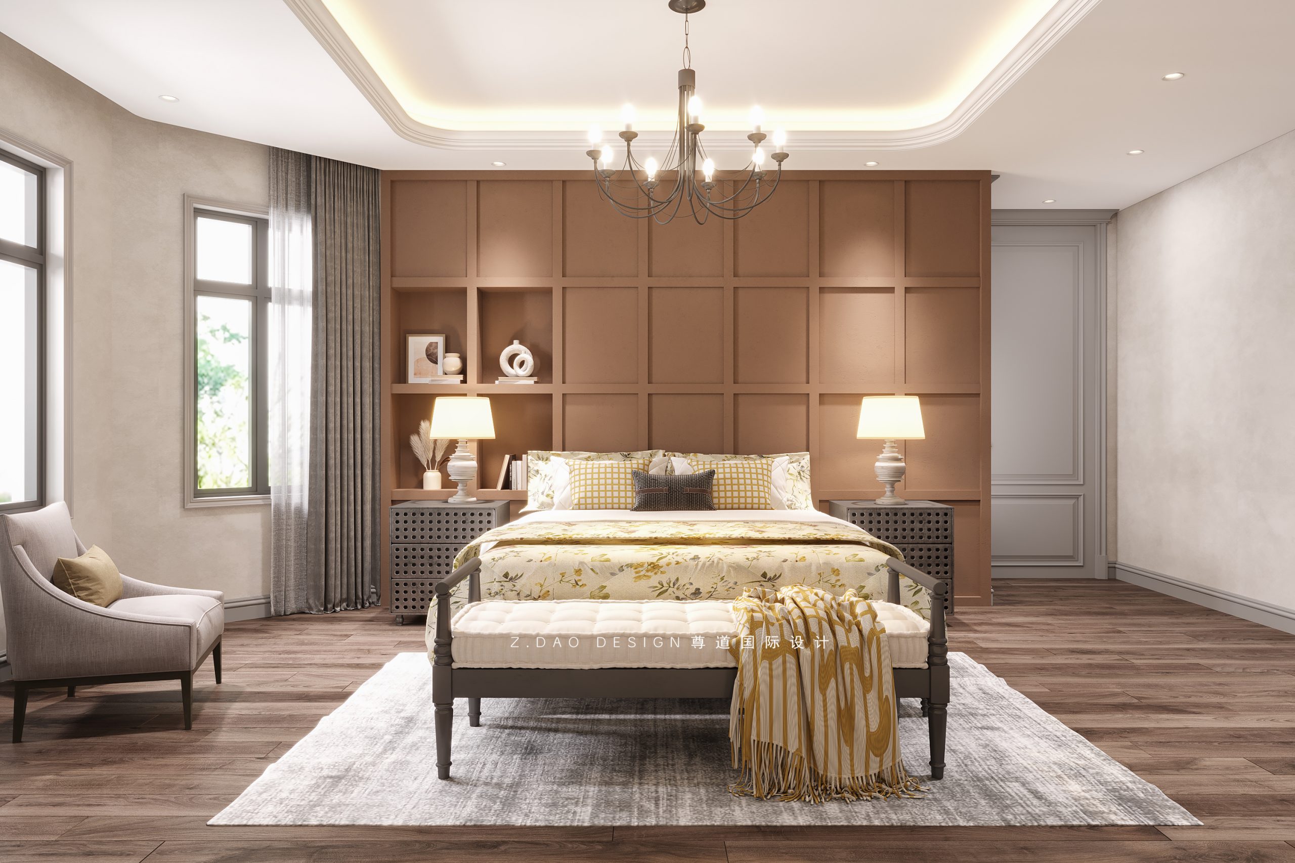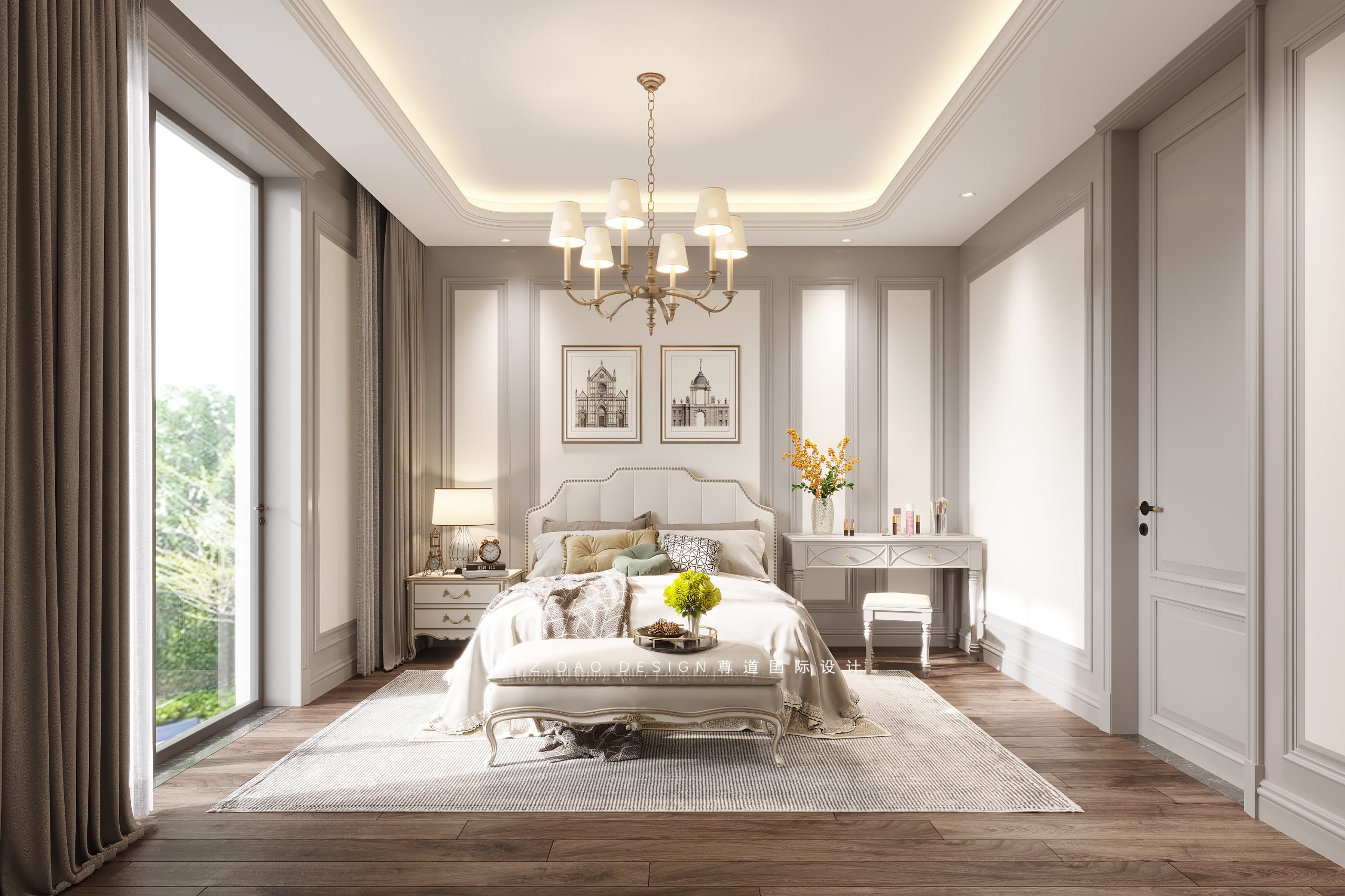 主卧室色彩偏浅色系,借助丰富花饰、线条、质感的窗帘等作为装饰品,突出现代美式装修风格的特点,使房间更温馨、舒适。光线透过窗纱,营造柔和安宁的氛围感。低调的色系不会过于张扬,同时又显露出一丝优雅的气质。