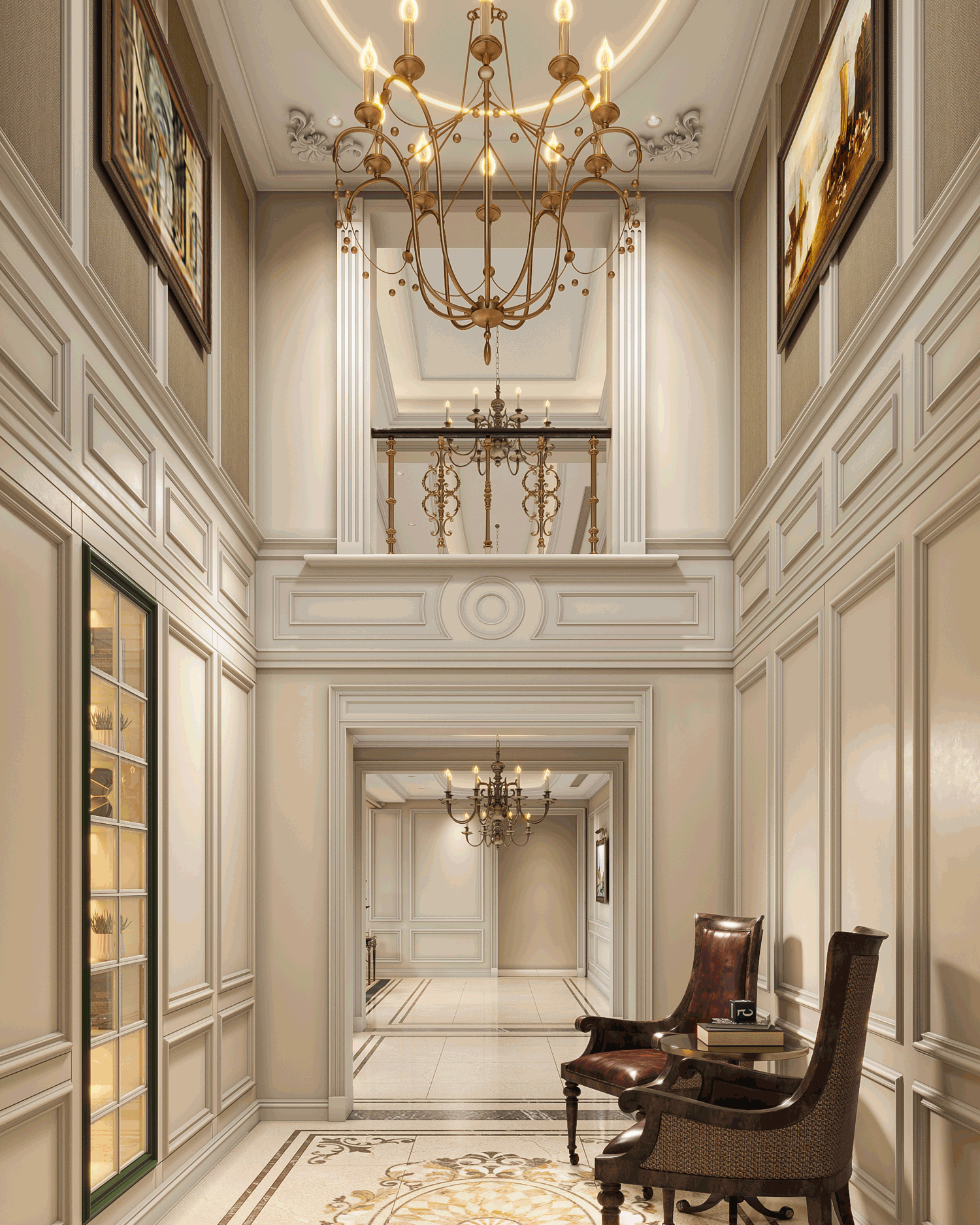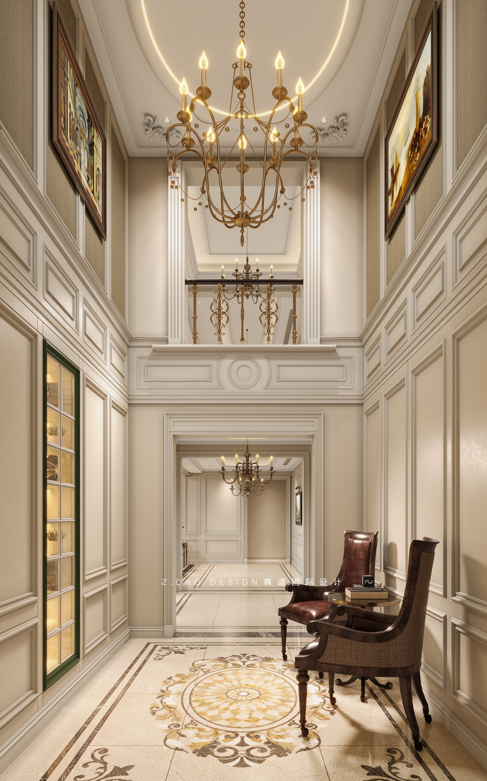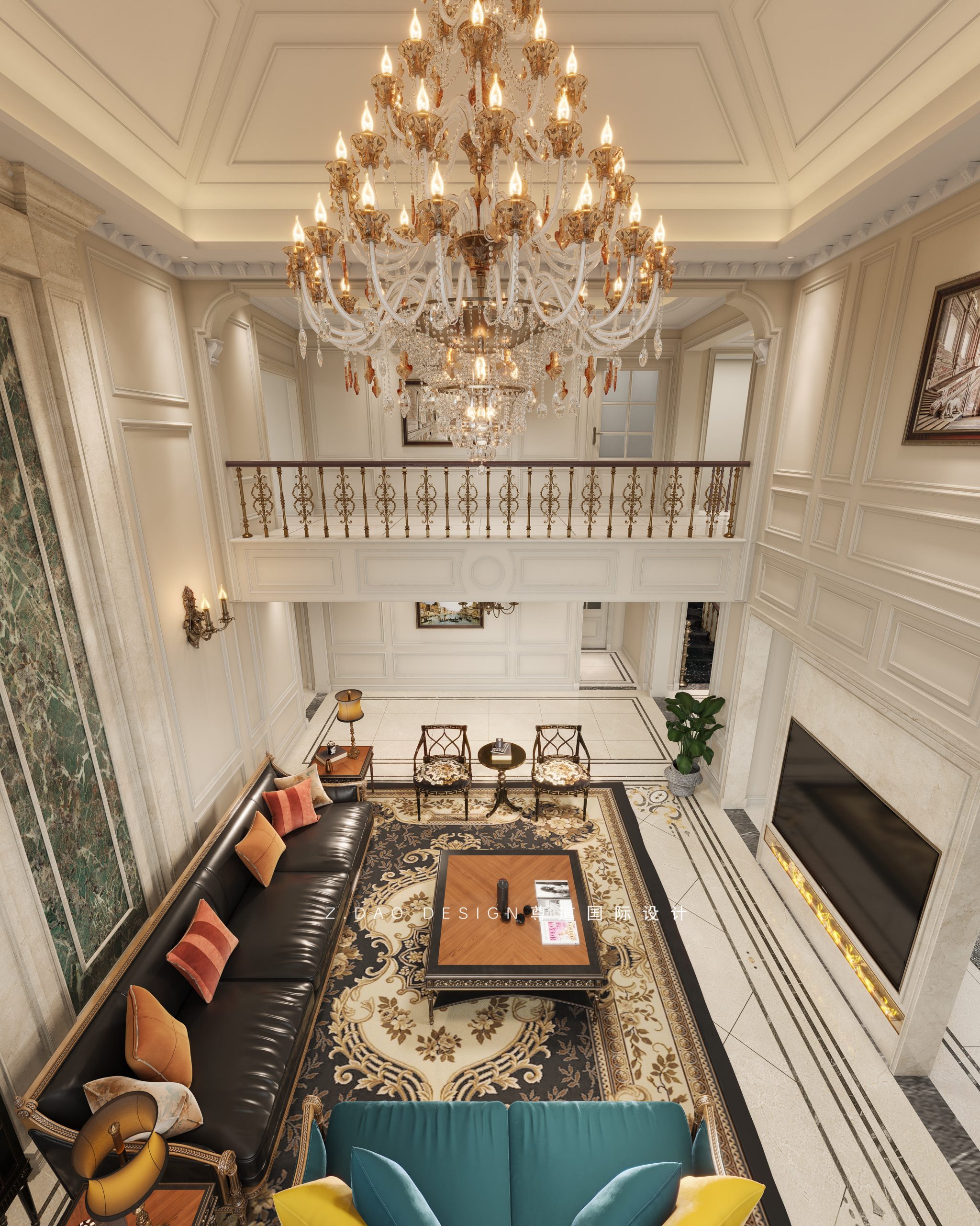二楼过道的金属扶手,墙面的石膏线条,顶面的吊顶,地面的瓷砖拼花,一立一平,一浅一深中,往往总能创造出有趣的空间语言。电视背景墙两边留出过道,方便人行走。整个客厅空间延续着美式的古典气韵,背景墙分隔线条,营造出复古庄重的细腻质感。
