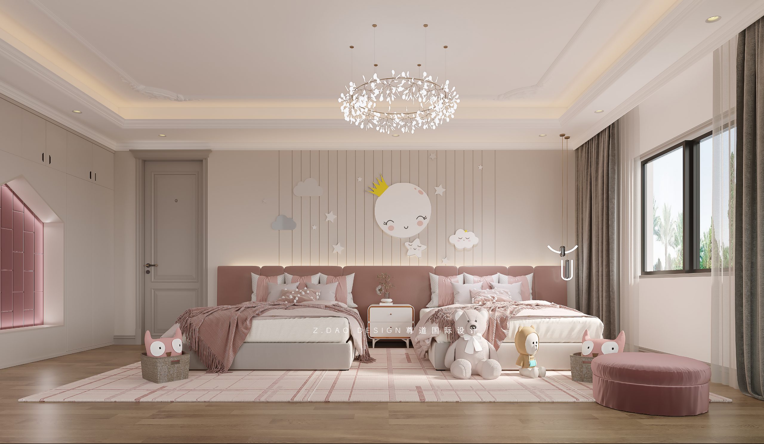 ▲效果图为人父母后,总是希望把最好的留给孩子,儿童房布置在南面,窗户以最大设计呈现,让采光与通风达到最佳。空间以浅粉色和白色为主,色彩搭配活泼鲜明。充满童趣的背景墙和床头柜,增加房间的趣味性,给予孩子缤纷自由的成长空间。与其说是儿童房,倒不如说是设计师和业主给小公主的梦幻城堡,在这样的家里,小公主每天都是“Happy Day”.