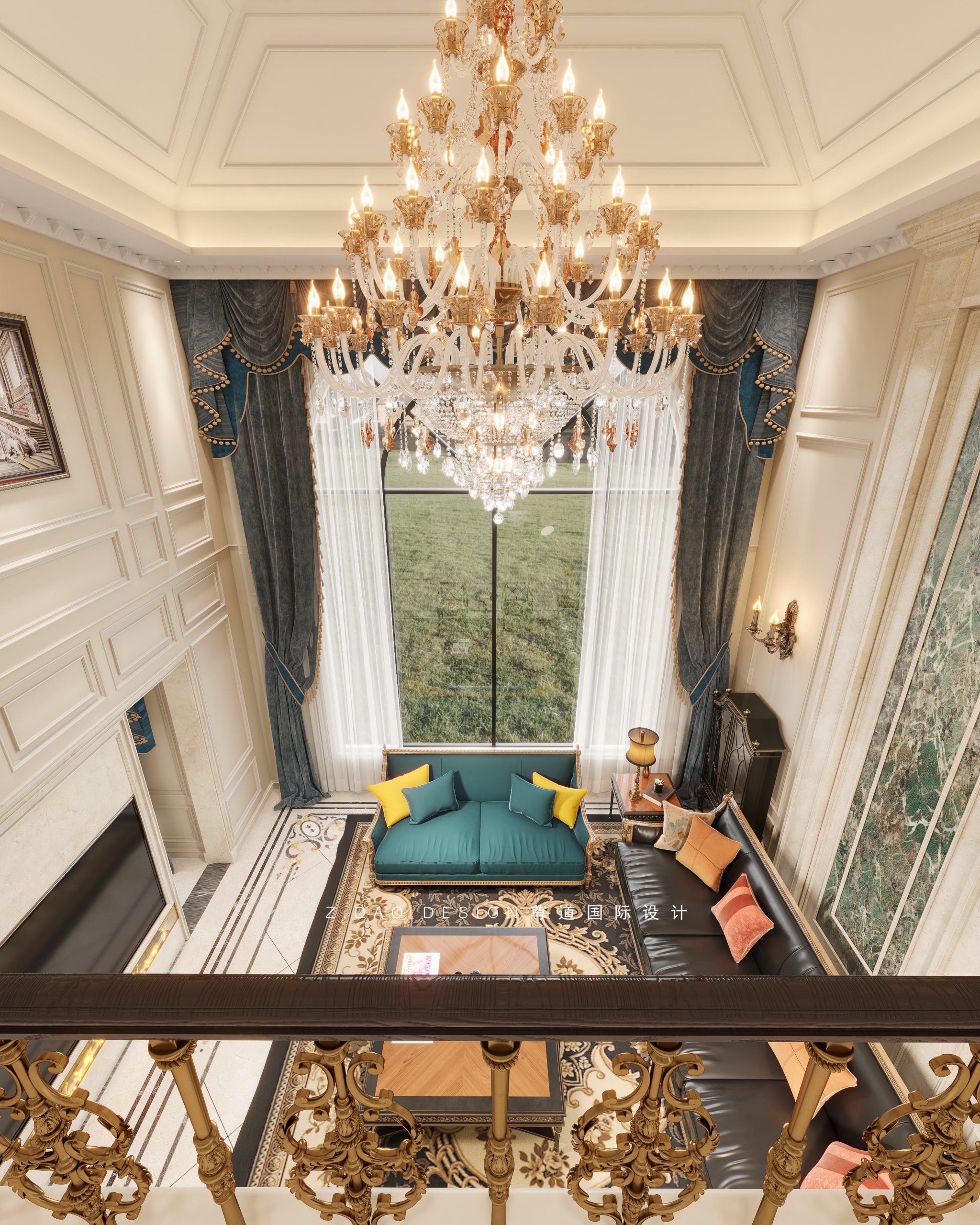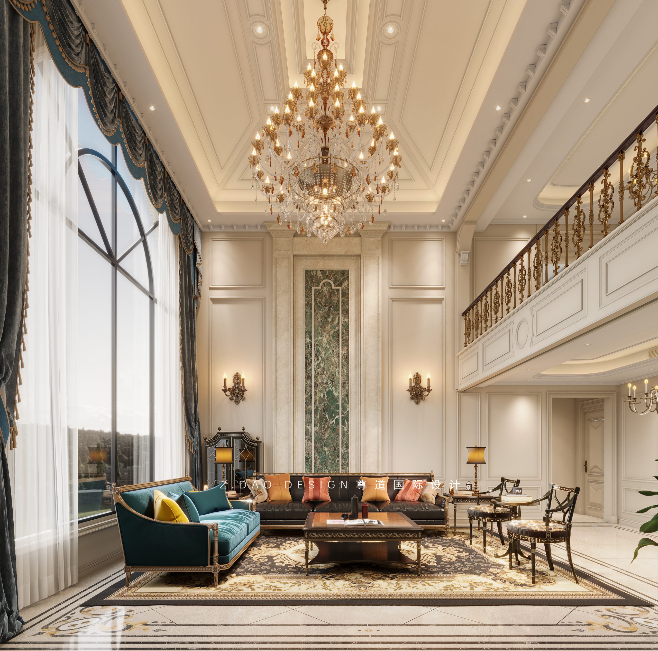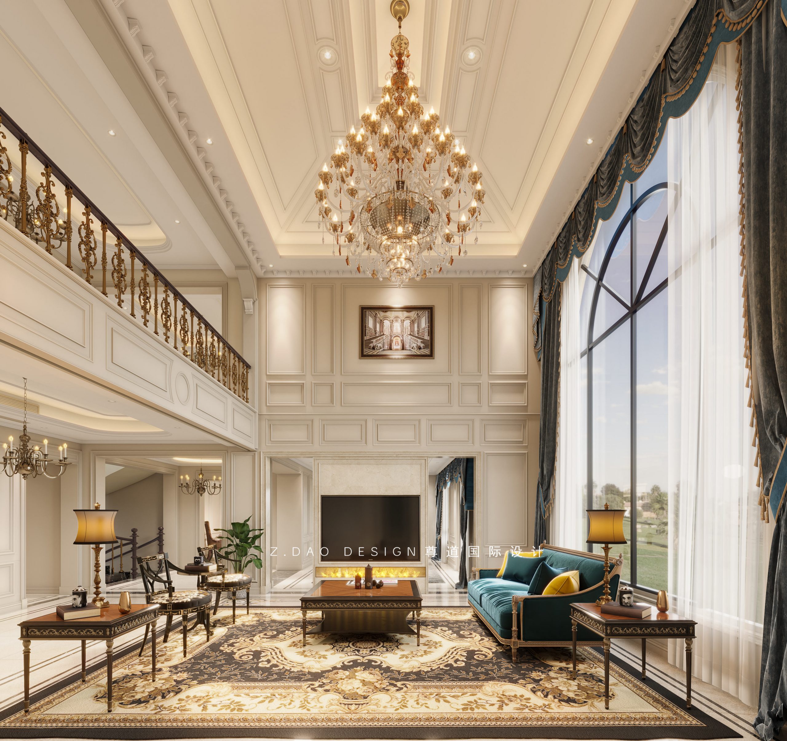 客厅区域做挑空,拱形造型吊顶搭配大型水晶吊灯,墙面采用护墙板与大理石,整个空间显得大气而又不失格调。超大的落地窗可以让充足的阳光照射进来,空间更加通透明亮。阳光透过薄纱撒在孔雀蓝的靠椅上,迷离的美意在流金岁月里,安然静好,美态尽生。