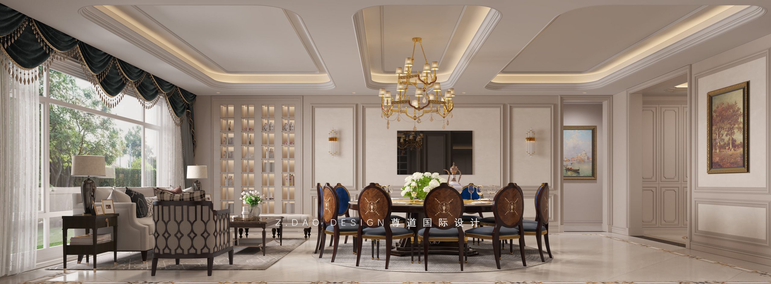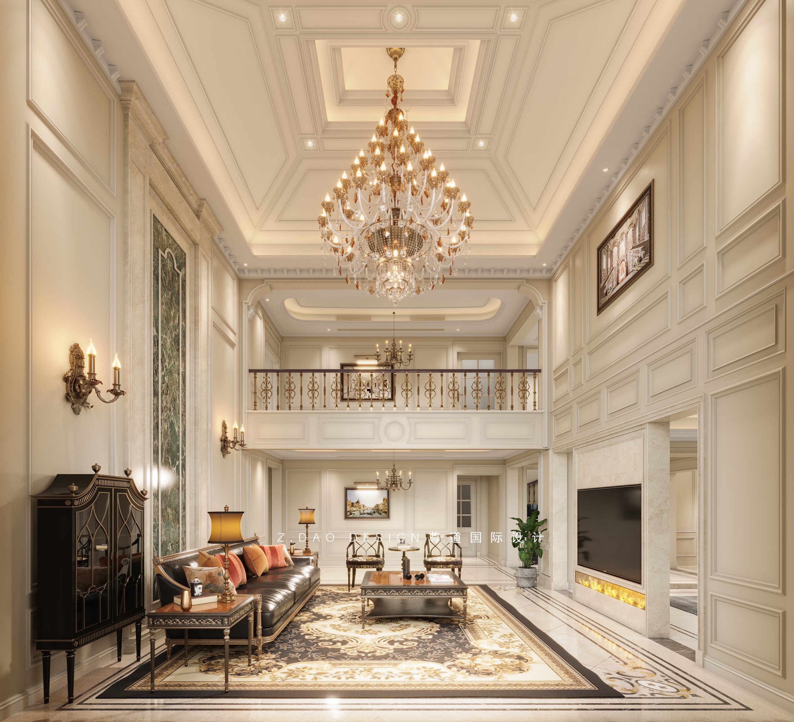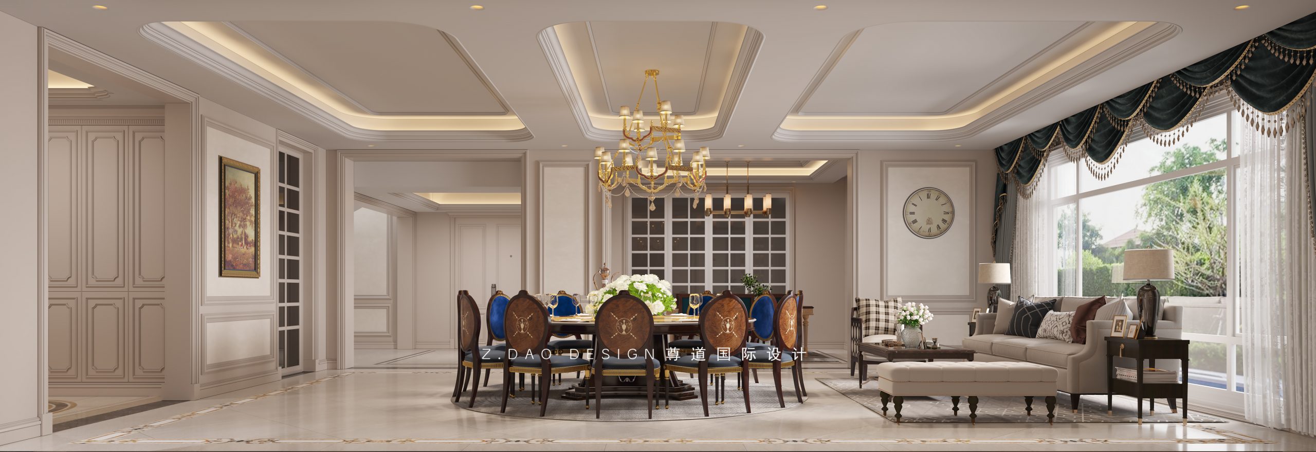 客厅区域做挑空,拱形造型吊顶搭配大型水晶吊灯,墙面采用护墙板与大理石,整个空间显得大气而又不失格调。超大的落地窗可以让充足的阳光照射进来,空间更加通透明亮。阳光透过薄纱撒在孔雀蓝的靠椅上,迷离的美意在流金岁月里,安然静好,美态尽生。