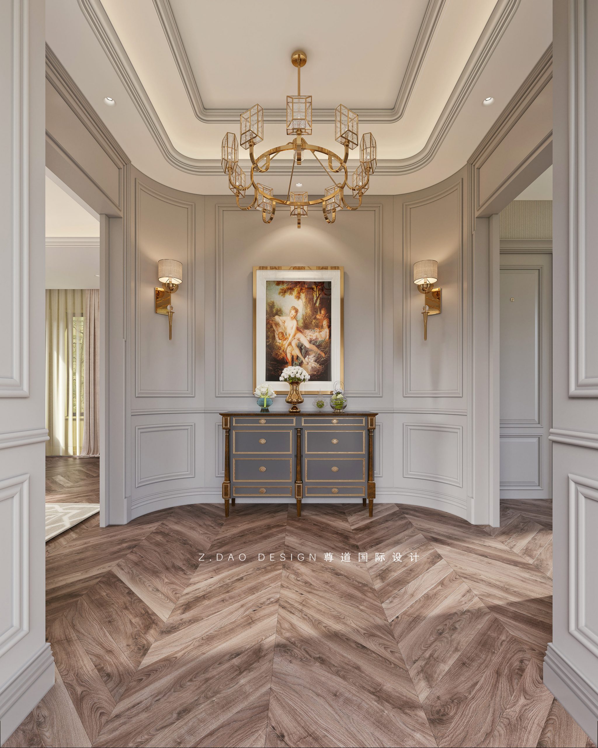▲效果图玄关作为一种生活态度的缩影,仪式感兼具实用性是必不可少的。地面上的拼花瓷砖,木制的玄关柜和舒适的换鞋凳,无不体现着美式风格的大气与舒适。