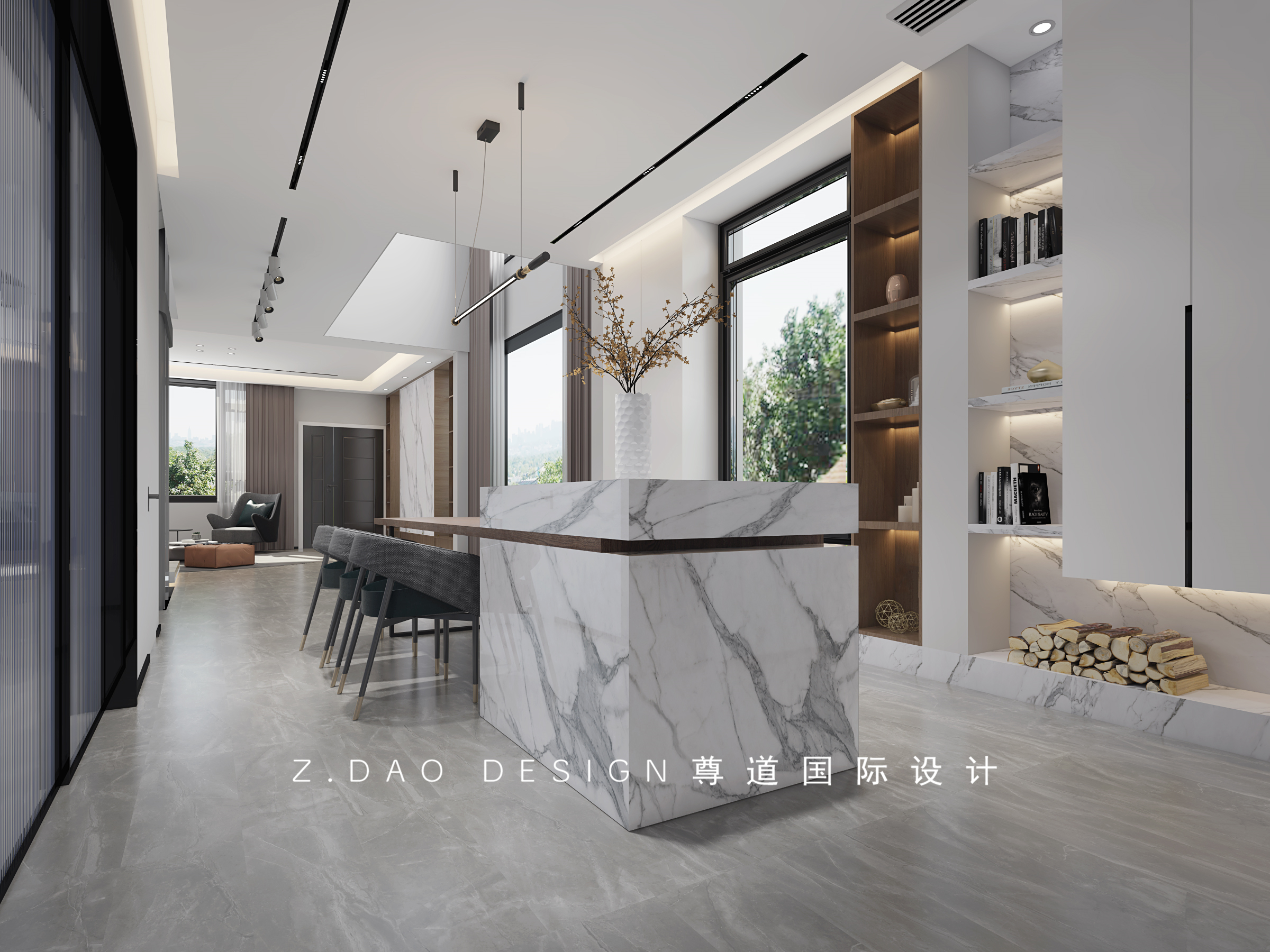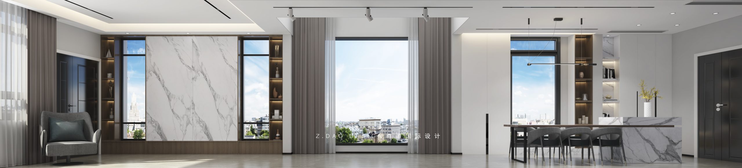 木饰面+岩板的简素之美,形成内外连接的界限空间,给人舒服的入户氛围,宁静而纯粹,带着自然的气息,(中间岩板可往两侧移动,遮住窗户光线,便于观影)来远离外界的嘈杂,去享受待在家里的悠悠时光。
