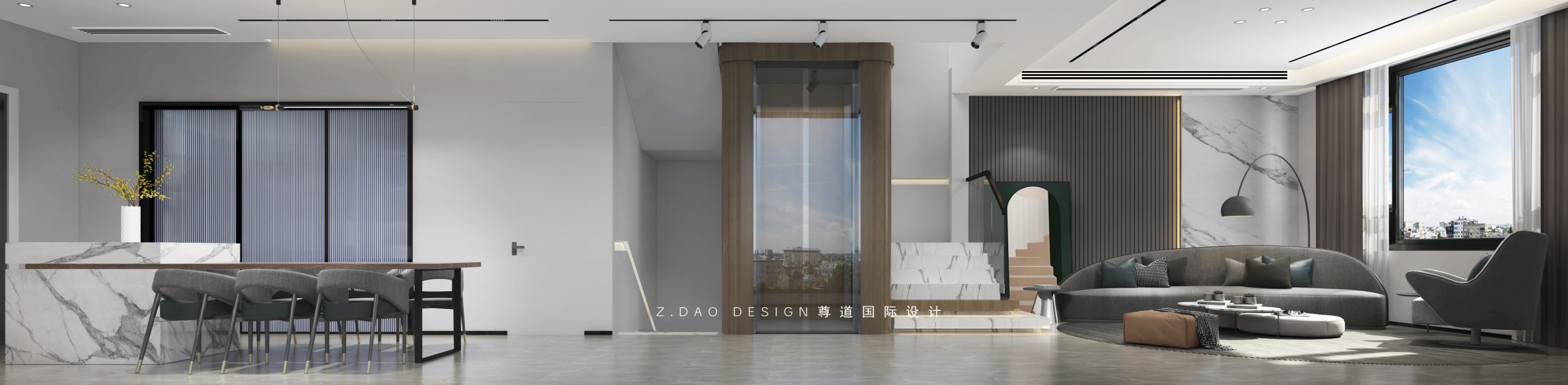 一层空间墙面以干练利落的形式,兼容糅合材质与中性色彩的软装配饰,软装与硬装两者间的立与破、融合与碰撞,造就了空间上的慵懒与理性之风,给人立体上的延伸感。