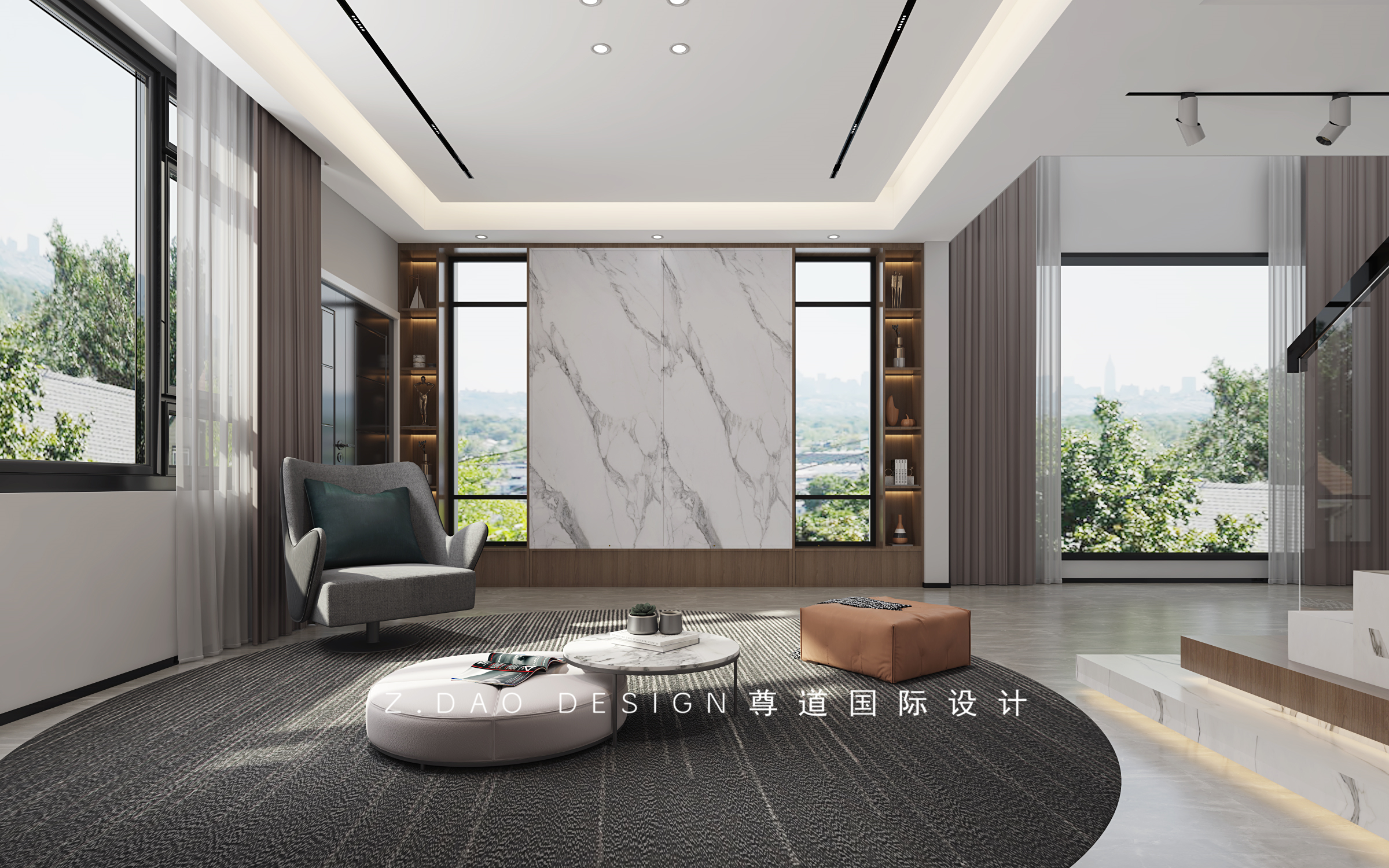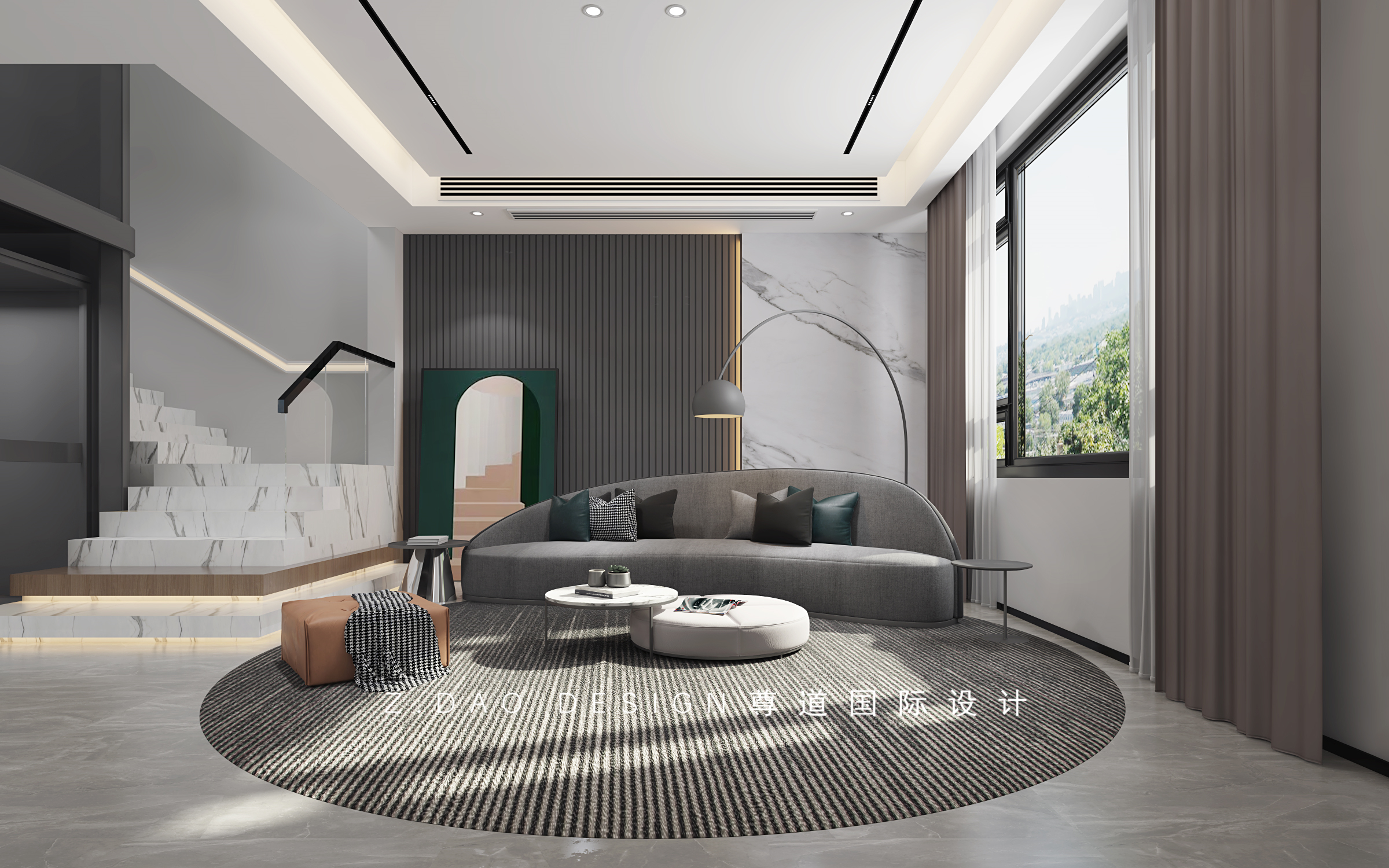 弧型的沙发包围区,紧靠窗户,充足的采光,让空间尽显大气。延伸第一个踏步,并把第二节踏步在材质上做了跳跃。