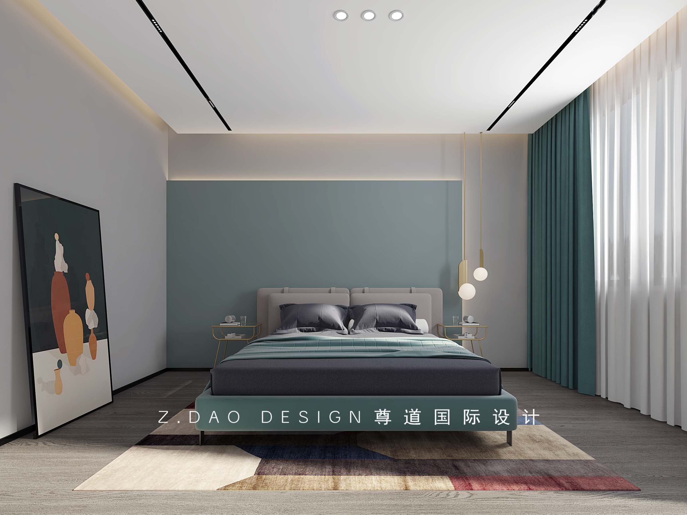 孔雀蓝与床头背景的颜色相互呼应,为素净的基础色,来点逗趣,融合与灰色和白色,将空间平衡到一个舒适的状态。
