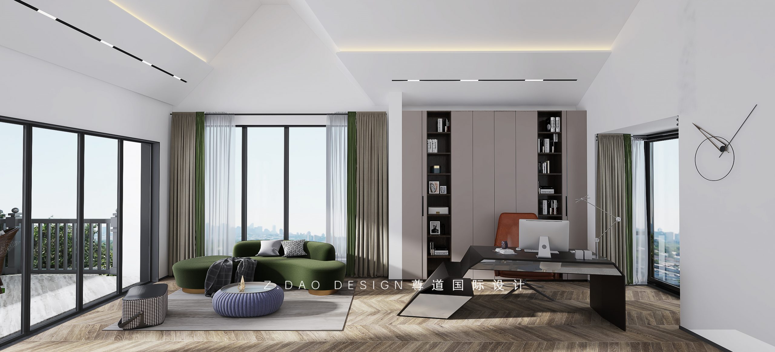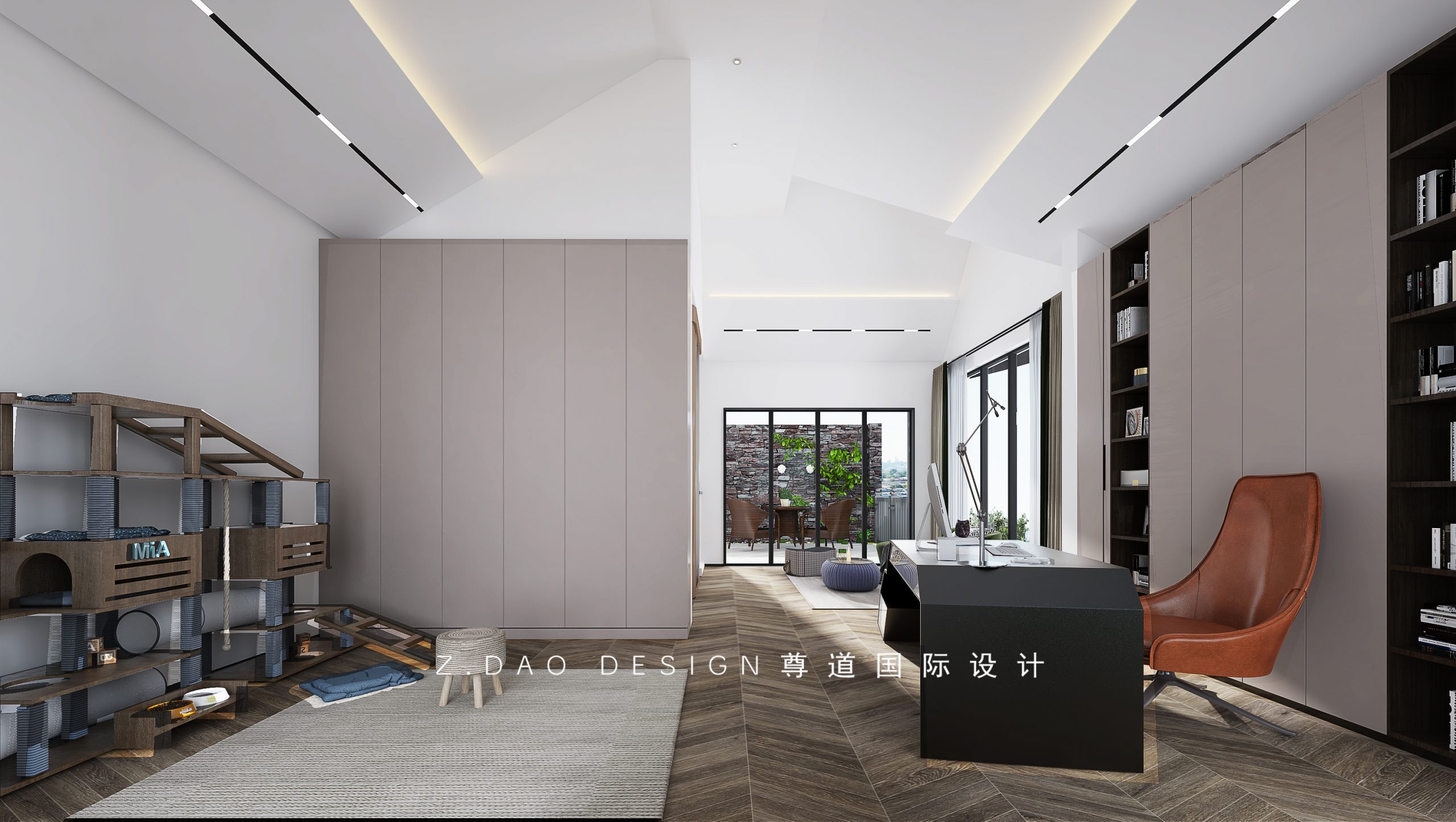 书房简单的线条,没有过多装饰和堆放,少不是呆板,利用功能结构和转折处理进行的几何切割,给空间增添很多小波澜。在四楼休闲空间中,既能享受悠闲地午后时光,又能欣赏美好的户外风景。