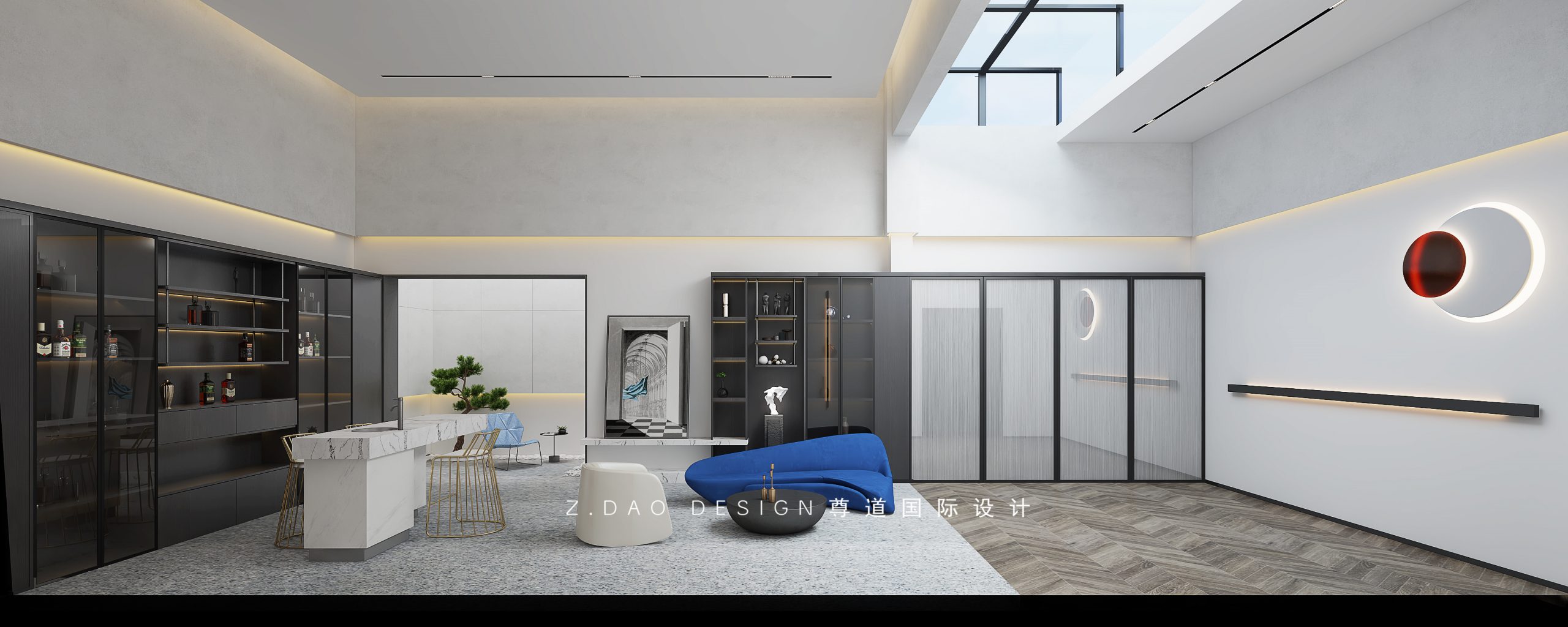灰调与白调,水磨石的地面,在克制的黑白灰色系背景下,蓝色的弧型沙发显得格外“生机盎然”。