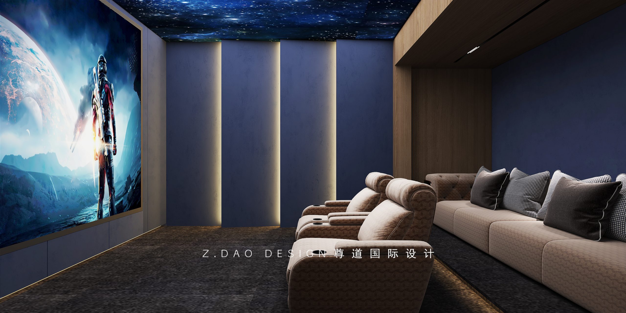 幽蓝色的墙面及绚丽的星空顶,像广阔无垠的天空,舒服的靠在椅子上,完美的视听效果,满足了你所有精神上的最高追求。