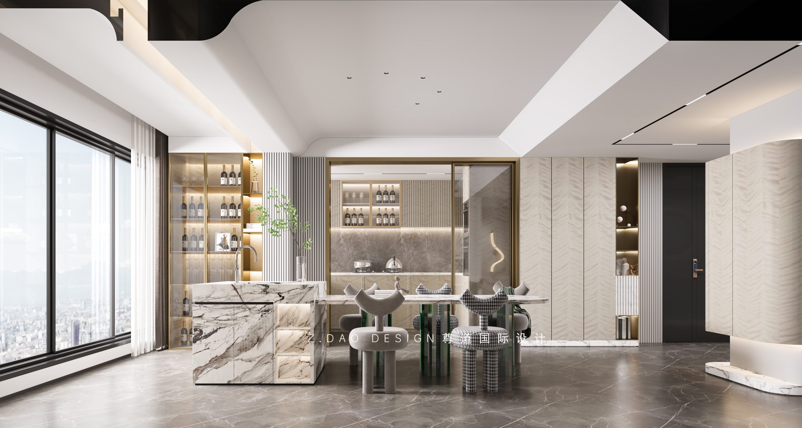 餐厅采用开放式布局+岛台设计。中岛厨房给人的第一感觉就是浪漫高级,然而除了颜值高,氛围感强,中岛的设计还可以让空间更有延展性,自由不拘束,可以更好的营造温馨舒适的氛围,赋予厨房多一层社交的意义。