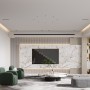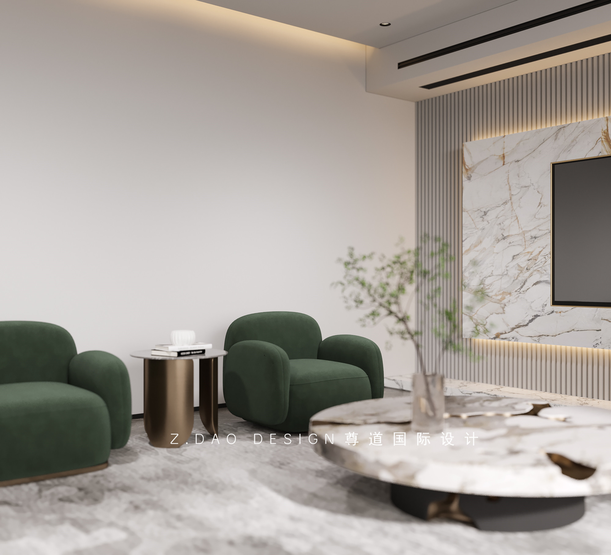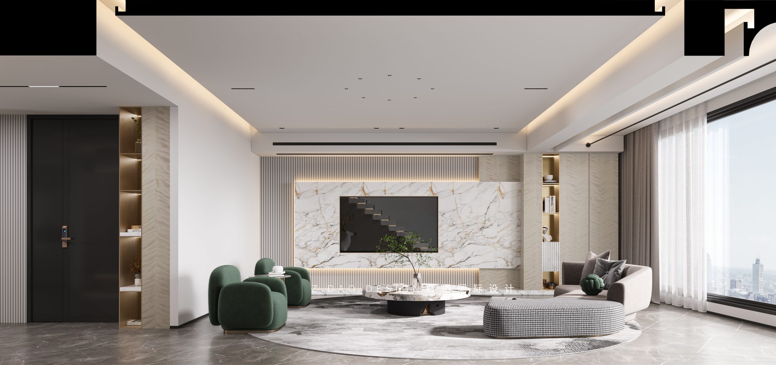 ▲效果图灰色的圆弧形沙发搭配圆形的毛绒地毯,为空间带来几何美感。带有大理石花纹茶几镶着不规则金属线条,营造轻奢的空间感,两个绿色系的单人沙发符合屋主的兴趣喜好也体现空间艺术感。