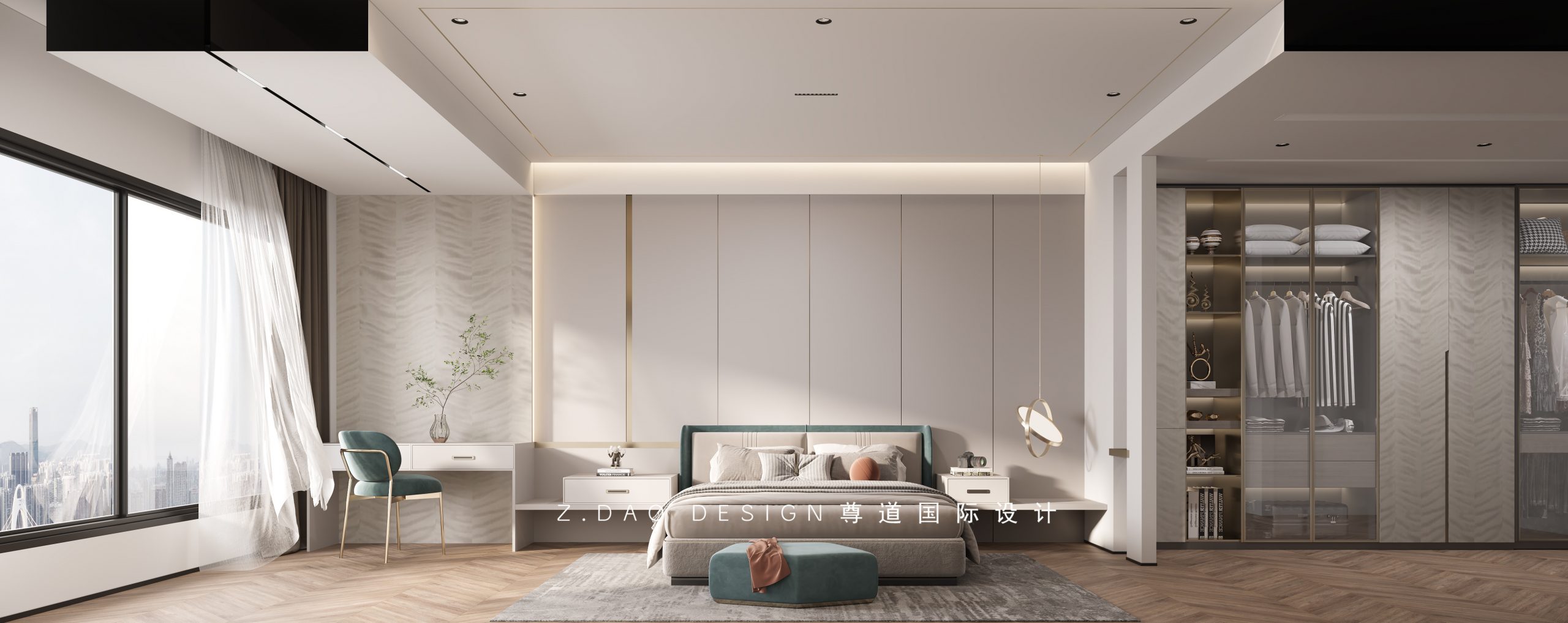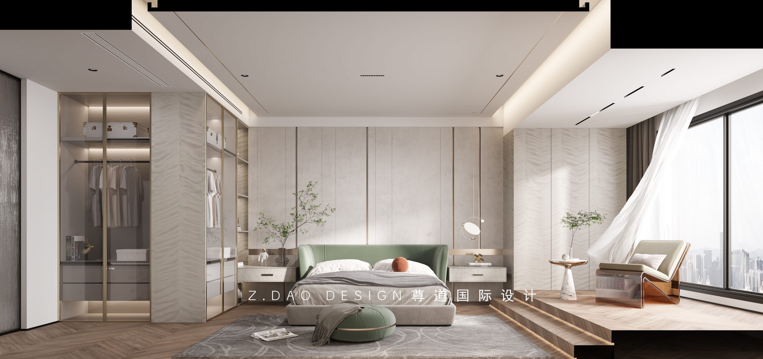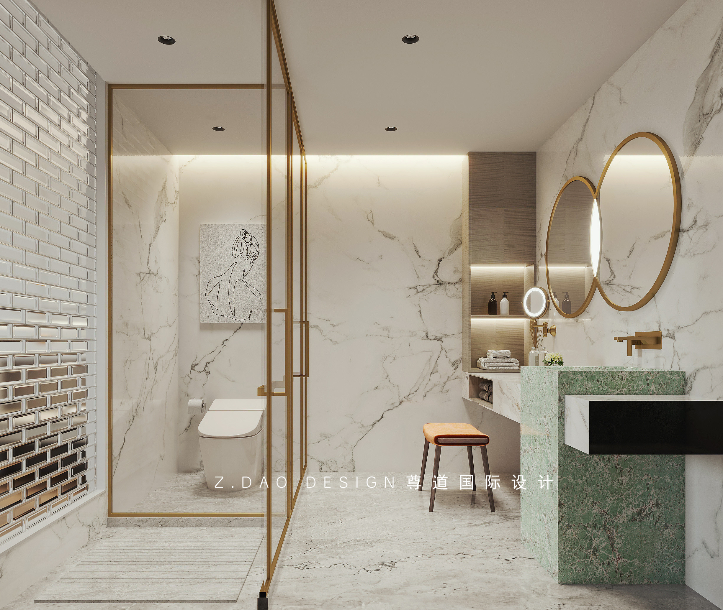 ▲效果图卫生间玻璃门、开放格、镜子边框用的都是金属材质,色调统一、轻奢简约,台面使用绿色系跳色引人注目,与主卧隔断的玻璃砖墙设计使卫生间光线充足,又增添了美观。