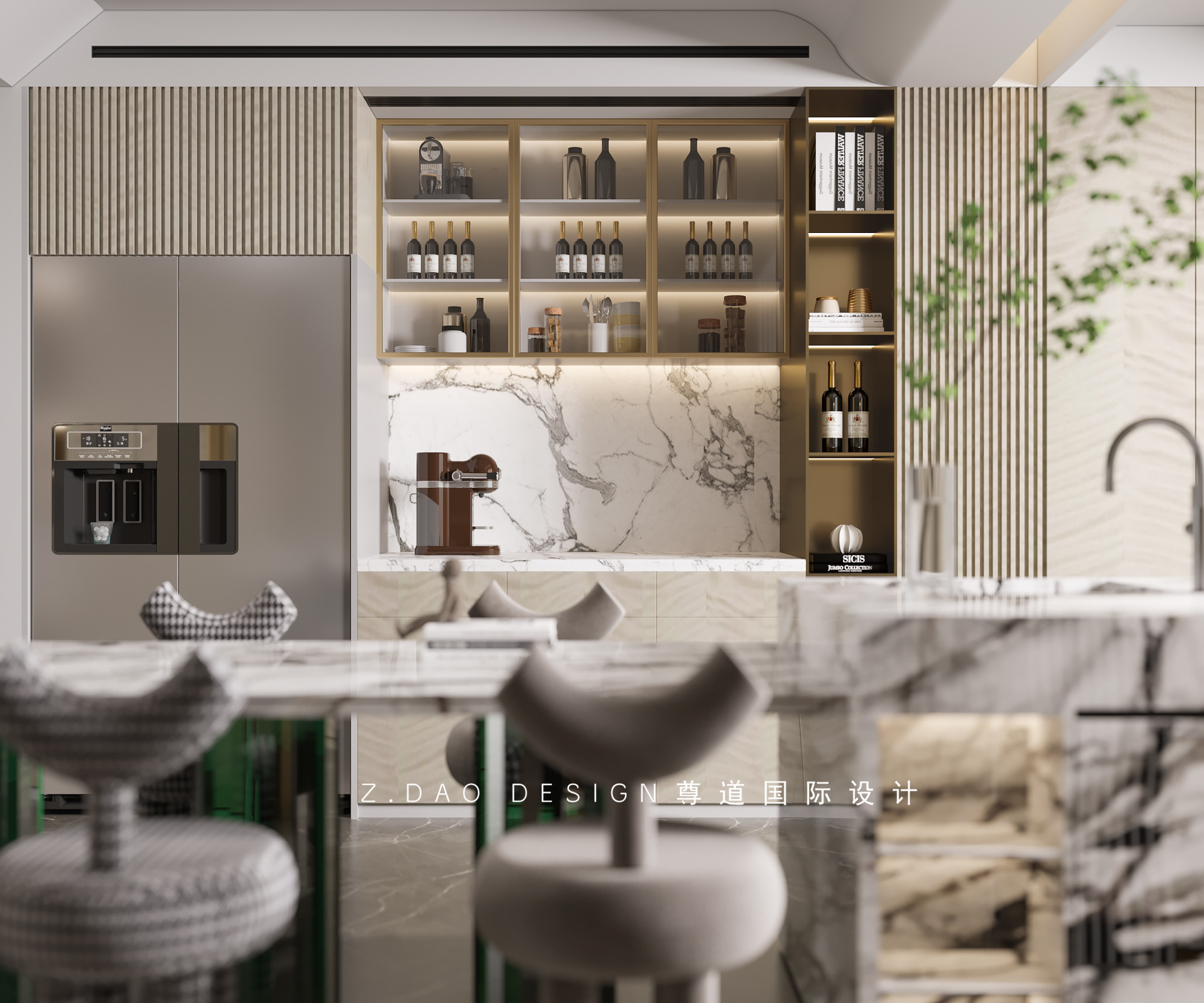岛台具备储物功能可以储存餐具。餐边柜加西厨一体,柜子开放格使用的是金属材质暗藏灯带,柜门设计是使用格栅板。厨房门口打造的柜子不仅收纳充足,美观度满分,柜子使用全金属材质,玻璃柜门加金属在灯光下闪闪发光。