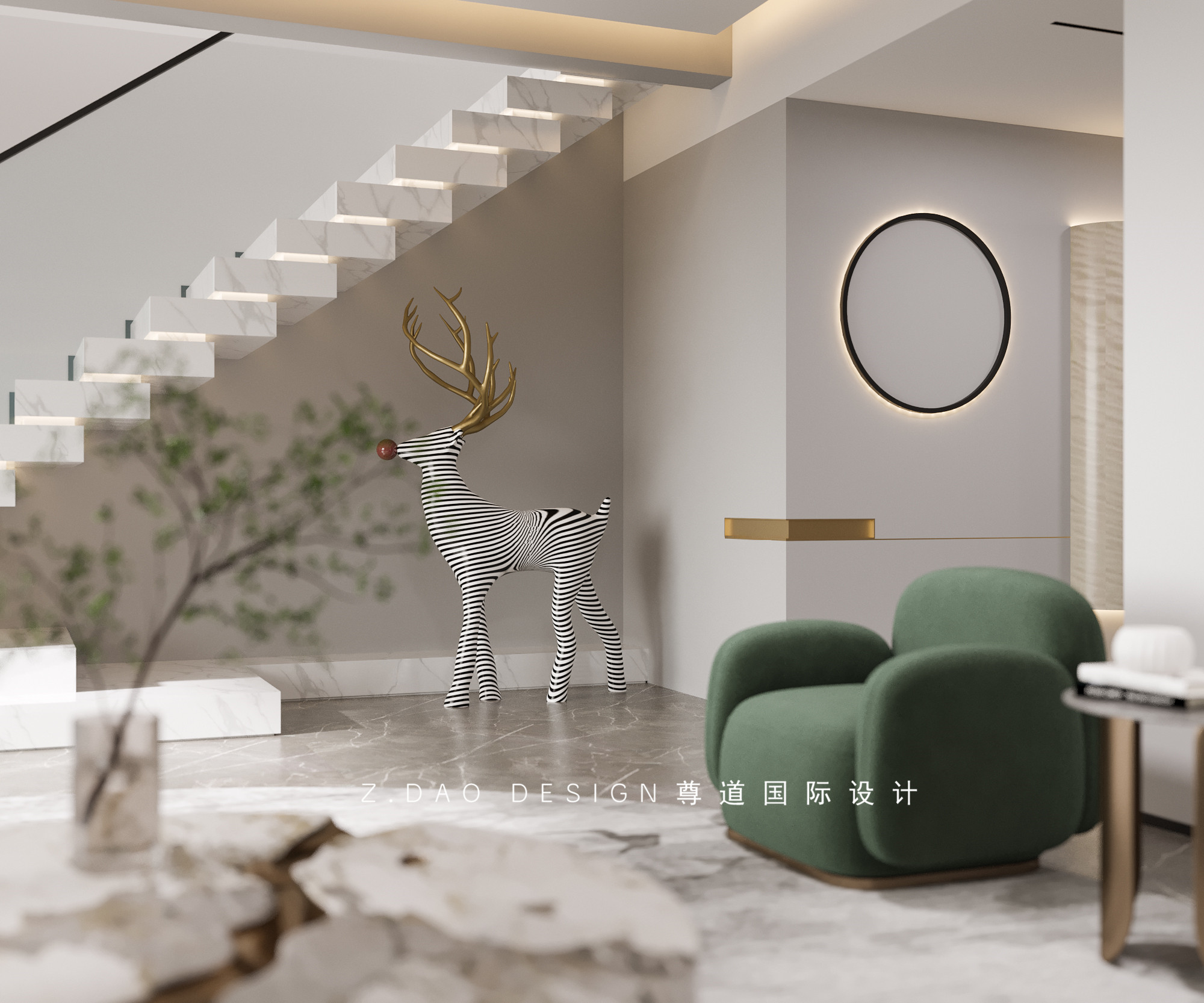 ▲效果图楼梯的设计也是一个靓丽的风景线,每一梯都加有灯带,加上玻璃扶手层次分明。楼梯下的小鹿摆放与整个空间融为一体更加烘托整个空间的风格。