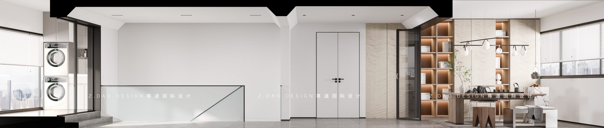 二楼南面洗衣区由两个踏步进入,背面茶室光线极好,储物柜打造与空间融为一体,开放格也是使用金属材质。主卧大门与墙面融合,斜面顶无不体现设计感。