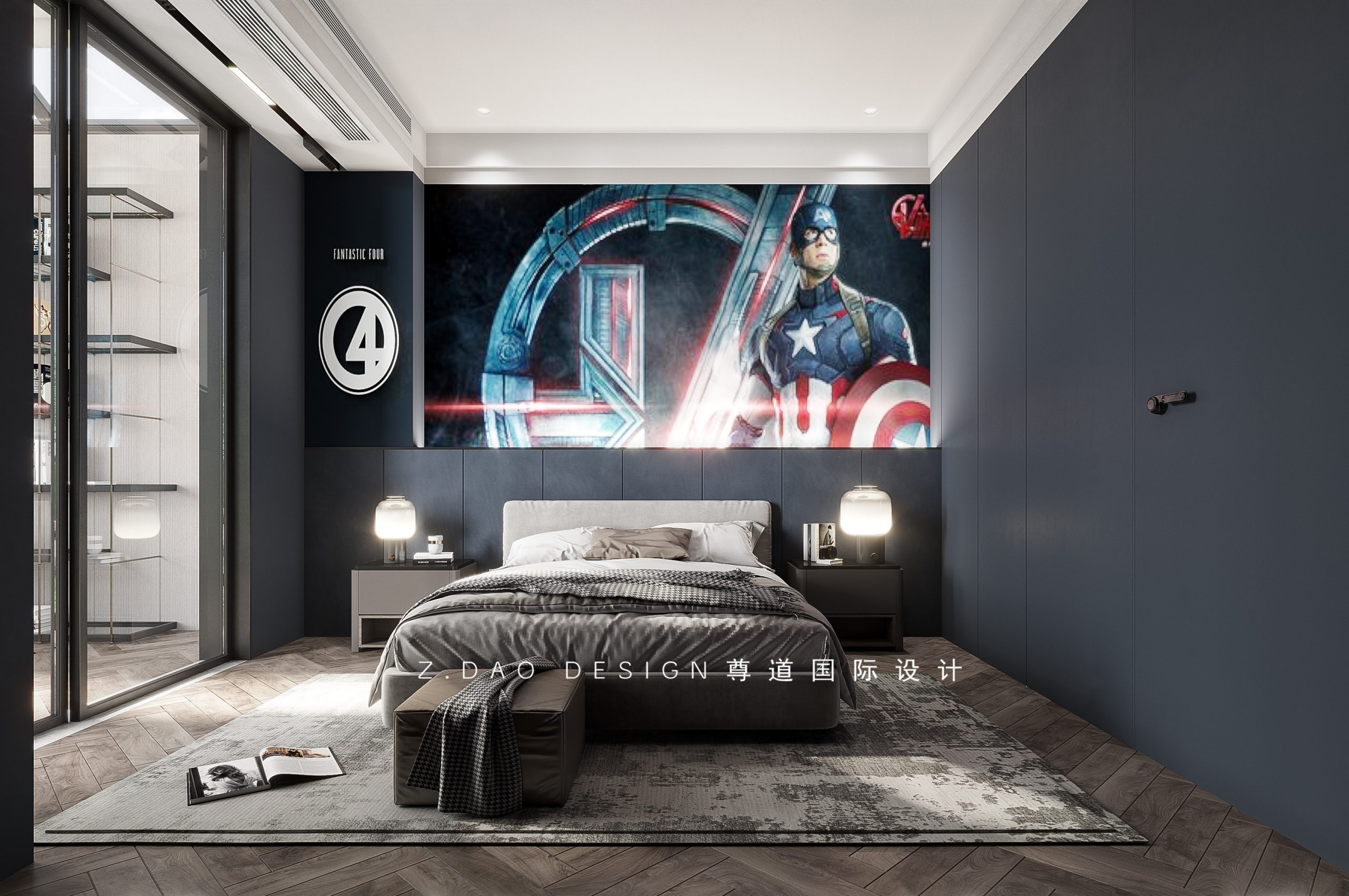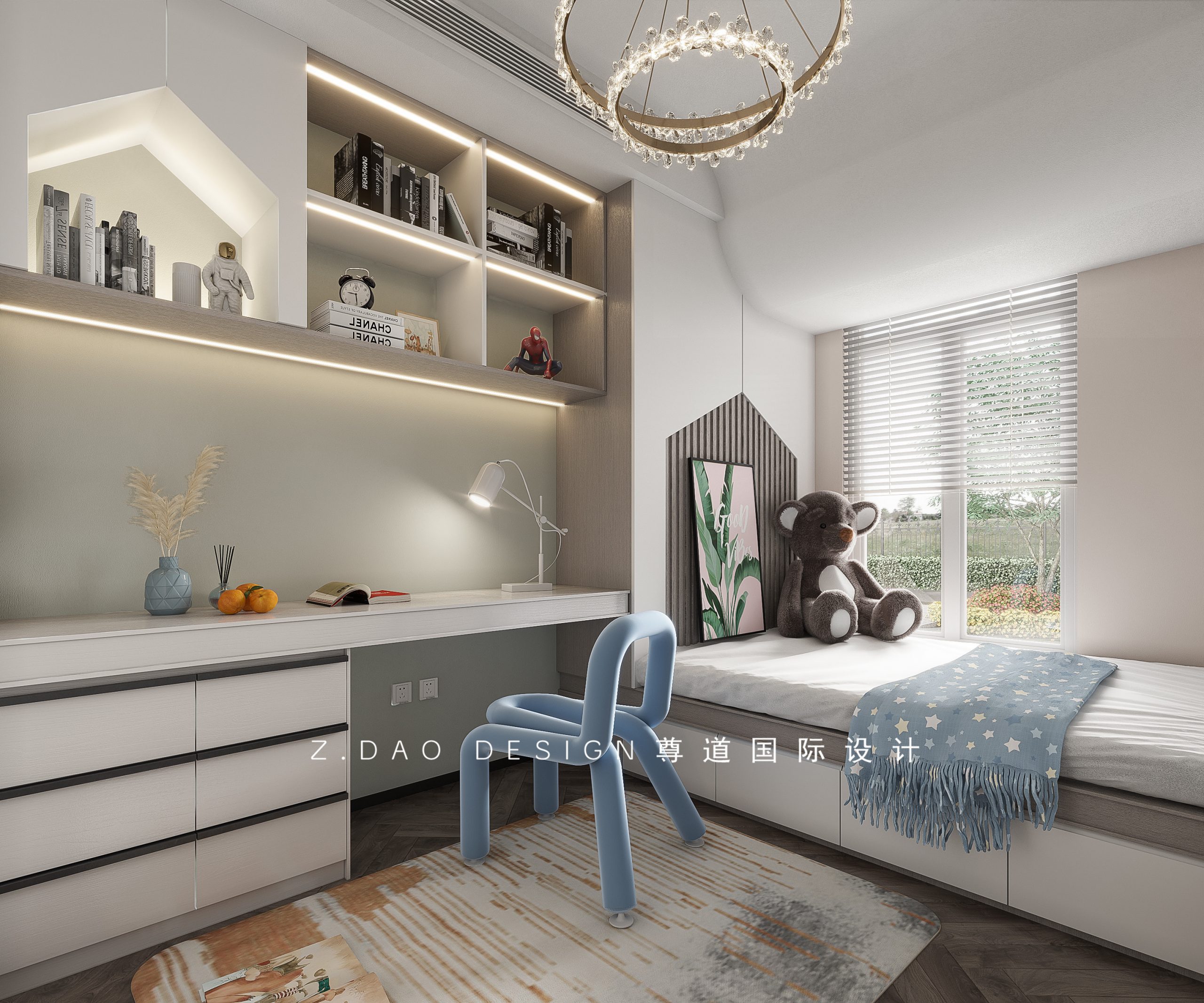 男孩特别喜欢复仇者联盟里的角色,所以男孩房以复仇者联盟为主题,以联盟队徽作为整个空间的主题色,房门与衣柜的颜色统一颜色,空间协调统一,床头背景的光带正好照在队徽上。
