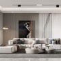 电视背景墙用岩板作为电视墙的主题,几何切割形成了几何块体的堆砌,左边是艺术涂料的长方形块体,右边是收纳柜体的长方体,中间为电视造型方长体。