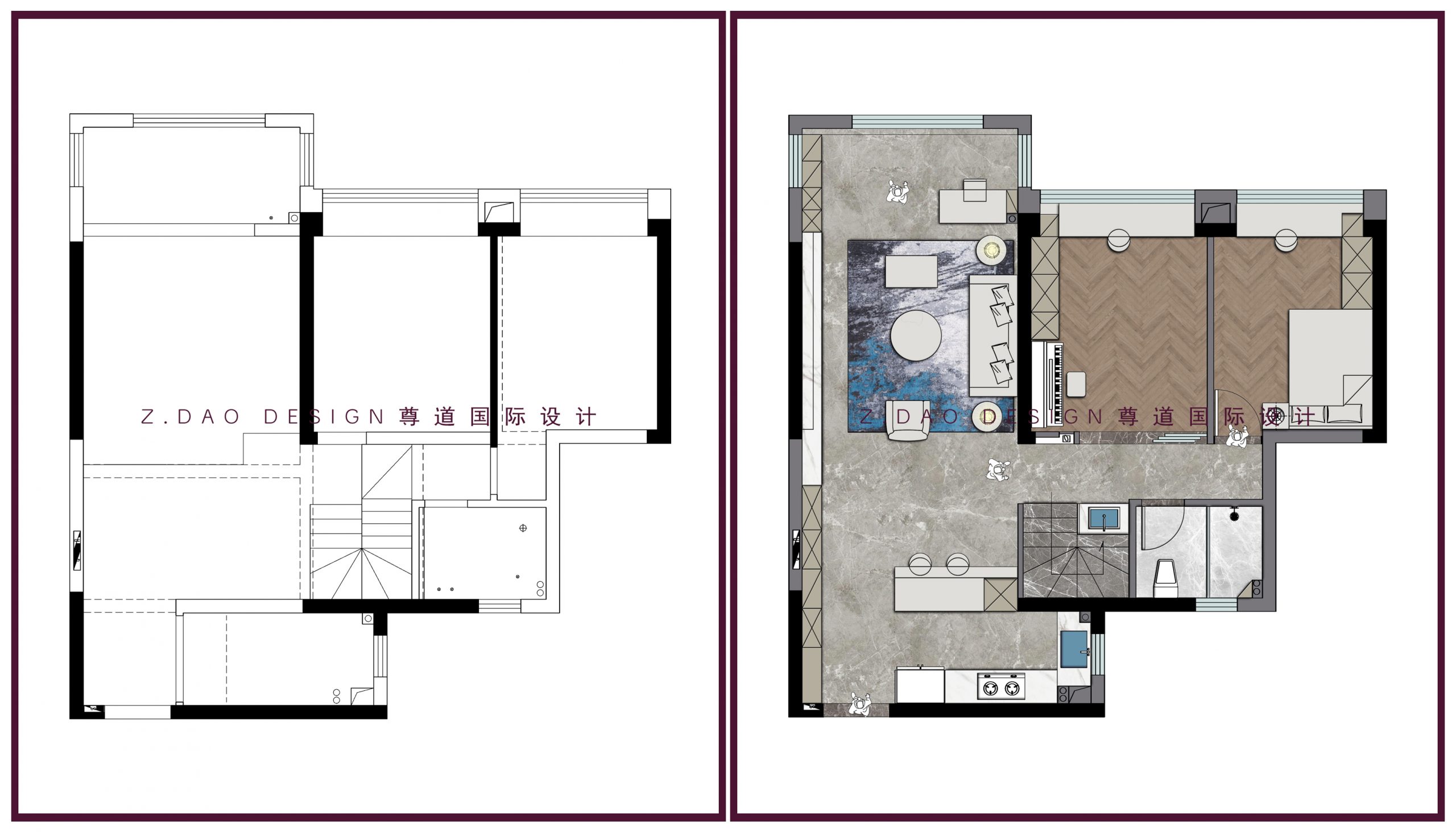 看到这个房型,其实房子的优缺点还是比较明了的,房型方正,客厅加上卧室都是朝阳的,动静分离是这个房子非常好的优点,房型欠缺的地方也有很多,厨房小且光线比较暗,楼梯的光线也不是很好。我们以此着重考虑,呈现了现在的方案。