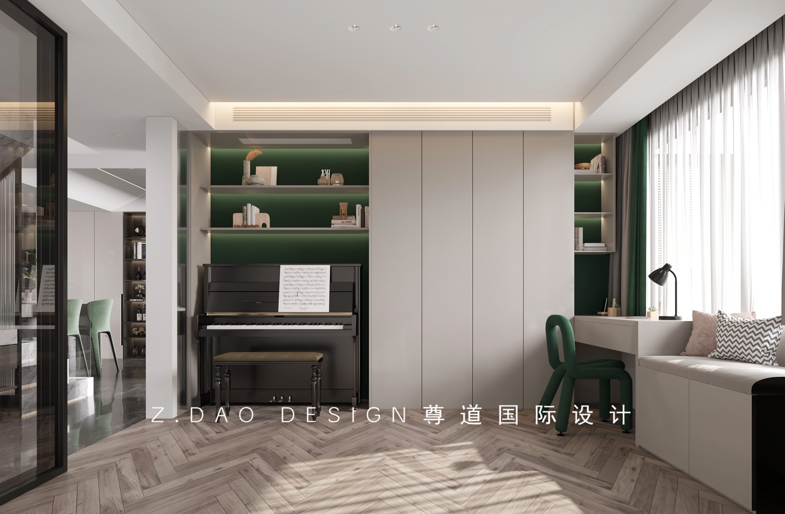 原先的飘窗拆除,设计成飘窗柜和书桌,满足功能的同时,增加了收纳。天花吊顶上面延续了客餐厅的无主灯的设计。在开放格内采用了跳色处理,增加了琴房内的趣味性。