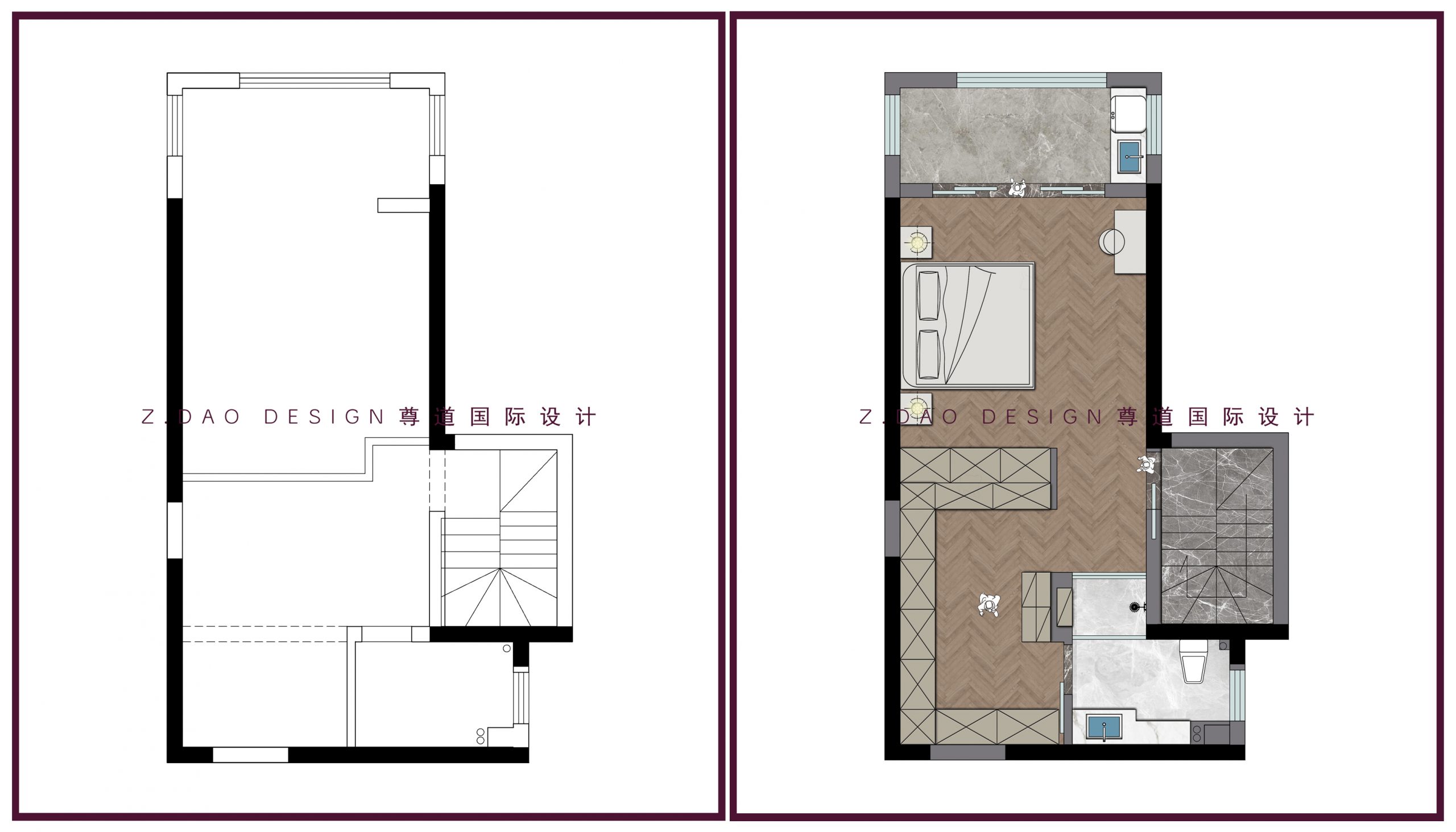 3、楼梯间与套房间通过180°平开门打开,避免了上完楼梯直视主卧的尴尬场景,北边设计成豪华衣帽间,满足业主收纳的需求。