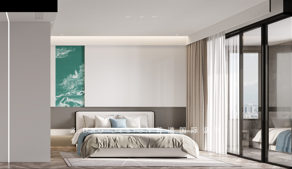 地面采用人字性造型铺装方式,增加了地面的立体感。 一字型的床头造型配合定制壁画以及无主灯的大面积平顶组合起来,床头反光灯带,使整个空间看起来非常的简洁大气。
