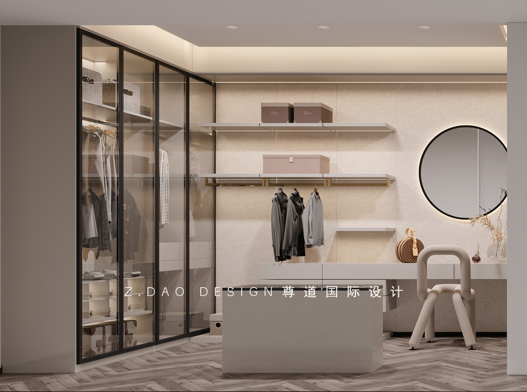 衣帽间内设置了梳妆台,简练的台面,肤感膜的柜体板,黑色铝框玻璃门,搭配圆形的镜子,突出设计感,将例行与感性的格调穿梭期间,展现出精致而优雅的生活品质。