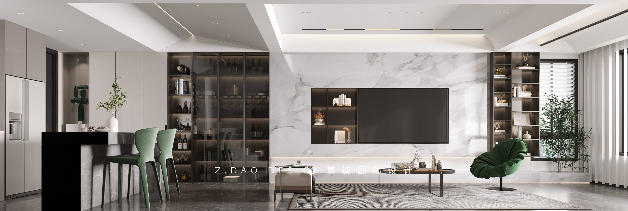 餐厨背景柜的设计上面,柜体采用了虚实结合,门板使用铣槽拉手、黑色铝框玻璃门和肤感膜柜体板柜门,柜体预留氛围灯,加上后期软装摆件,最终呈现柜体美学。