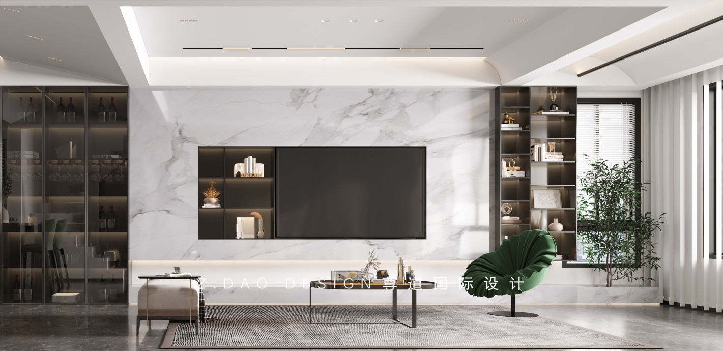 电视柜采用定制一字型地台并延伸,拓展电视背景视觉。