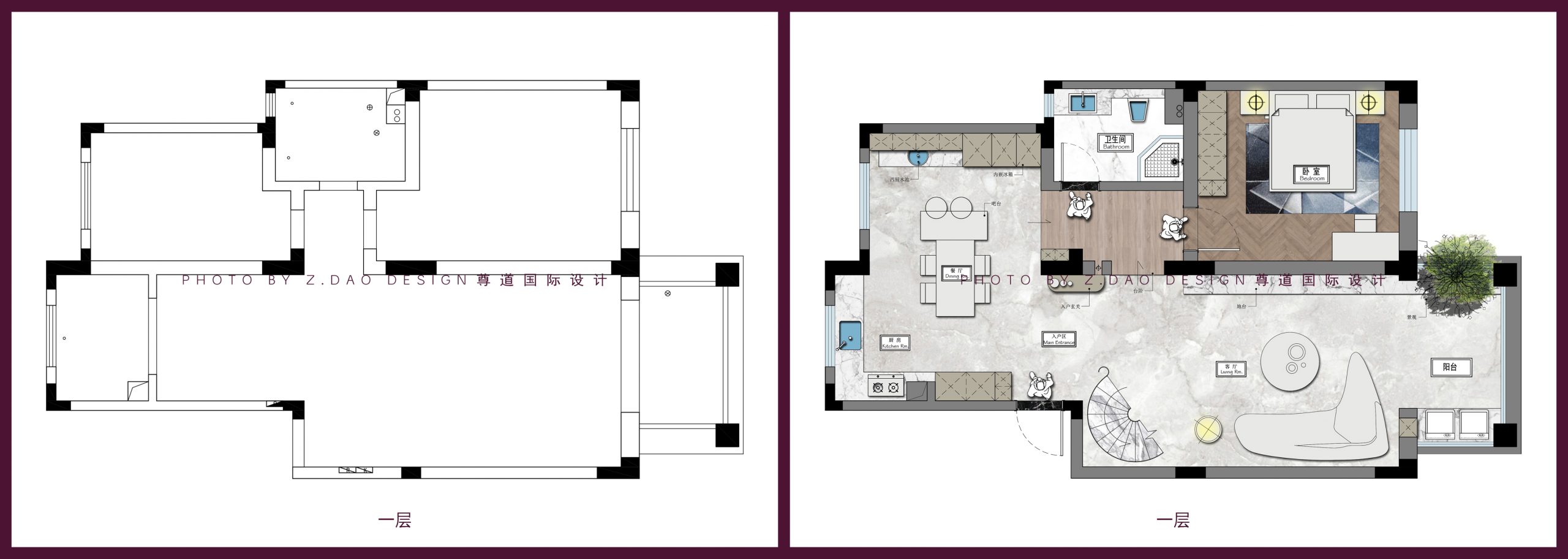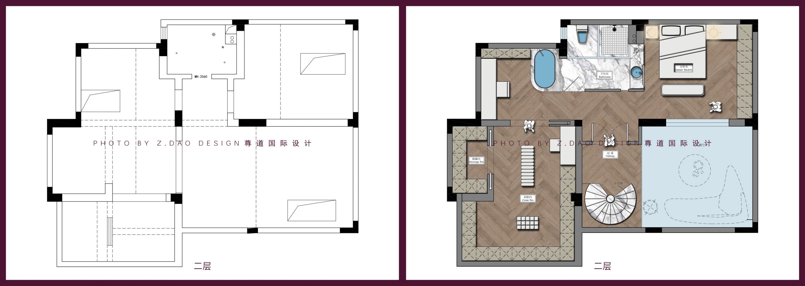 二层需要一个套房和大的衣帽间,更改最大的其实的空间的使用,以及合理的运用了空间大的部分,将空间解放出来,做成了与卧室的交流空间,这也正是业主想要的。