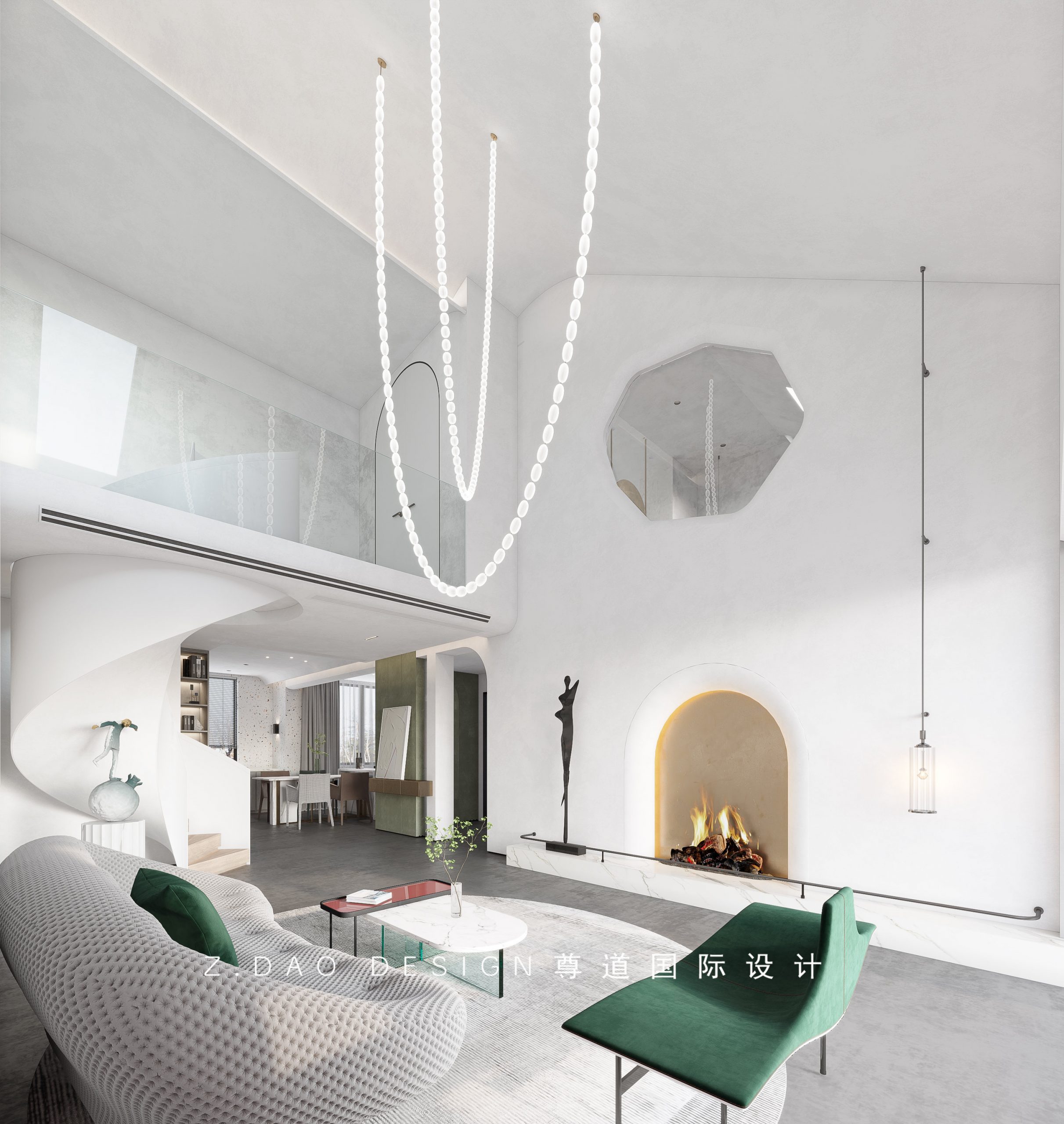 客厅用了挑空,这样使空间彰显了整体入户的档次感,客厅是和楼梯的区域连在一起,延伸的楼梯和玄关背景形成一体设计。电视背景墙打破常规设计,改为圆弧形的壁炉,使客厅的整个空间设计感加强,空间的一个围合感就出来了,阳光透过挑空天窗,穿过客厅一直延伸至走廊,光线在地板上变换着,舞蹈着。柔和了空间,增添了温度,为“家”温柔了时光。灯用了珍珠吊灯给整个空间增加了艺术感、氛围感。客厅空间以艺术涂料结合大理石的稳重,弧形的设计柔化了硬朗的空间,现代感的艺术座椅延伸了窗外的自然景观;为静素的空间增添了一份活泼之感。