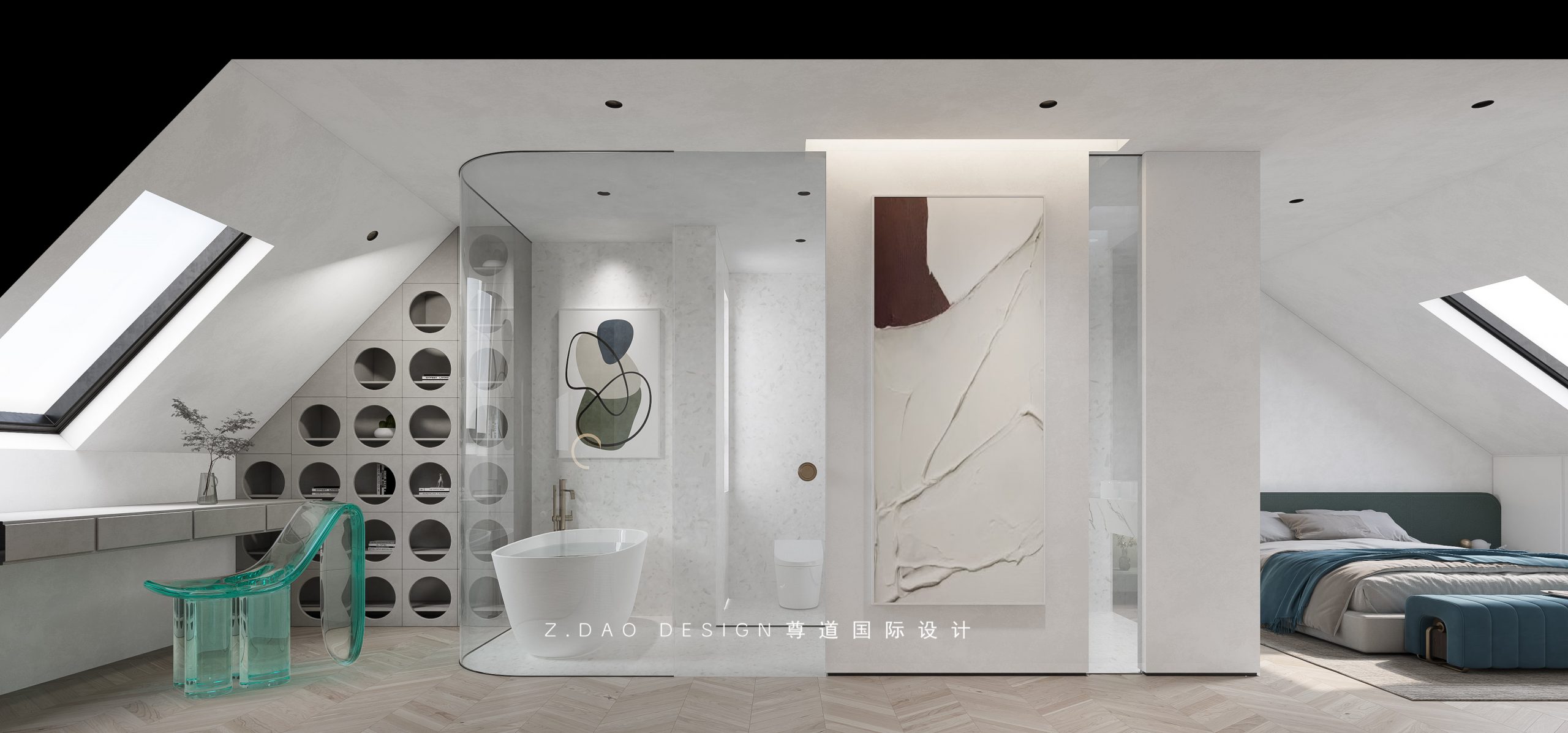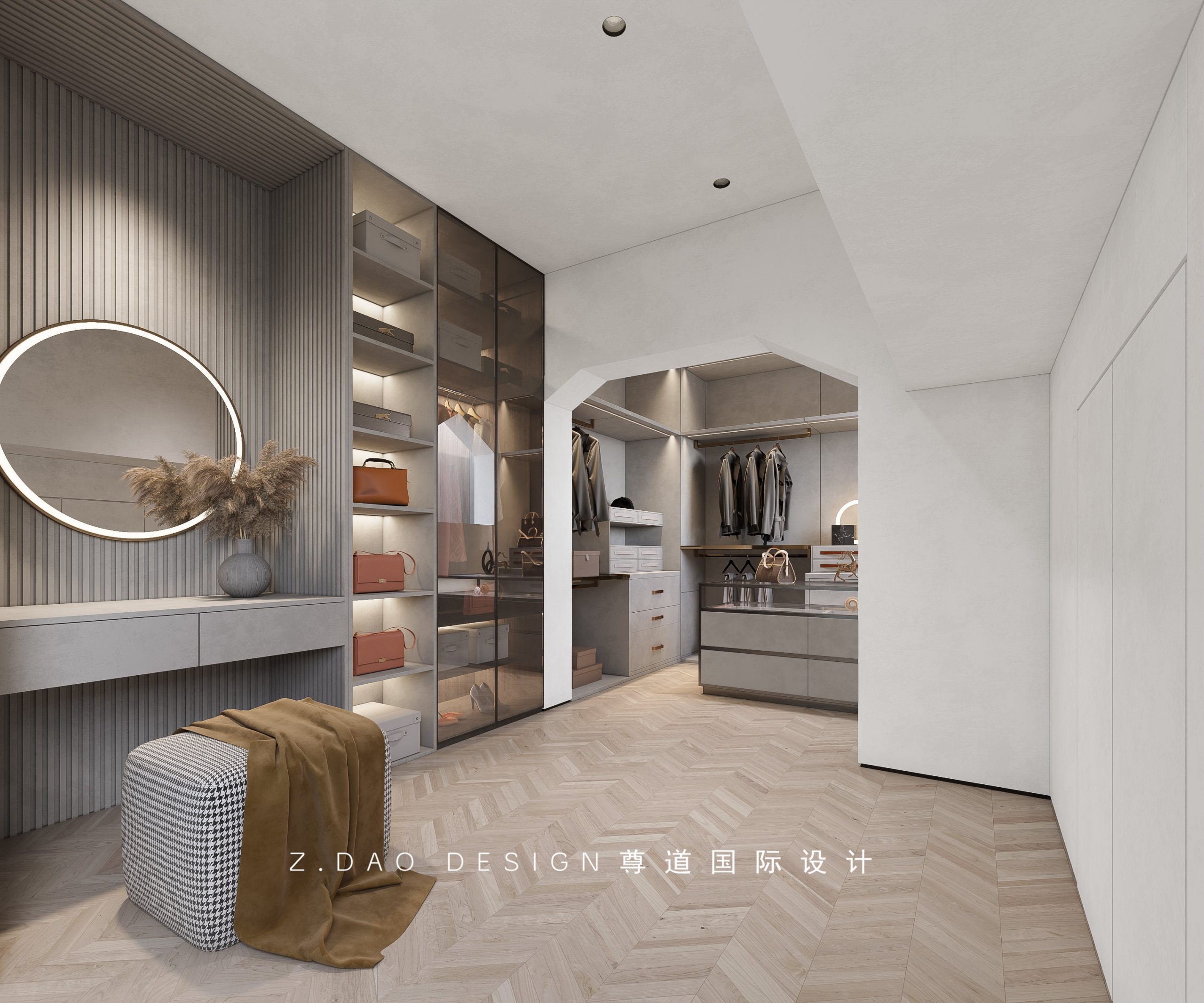 把卫生间卧室书房三个区域连通的套房,不仅没有破坏套房的整体性、通透性、美观性,反而使整个套房更加明亮通透,也增添了套房的实用性和不同寻常的艺术感,扩大了整个空间功能的使用性。衣帽柜加上梳妆台也是完美的搭配。梳妆台的空间也是女主人最喜欢的地方,衣帽间延续了主卧室套房的色调,所以选择了深色的空间,深色的设计在品质上可能会高于浅色系,让人觉得更有品质和档次。