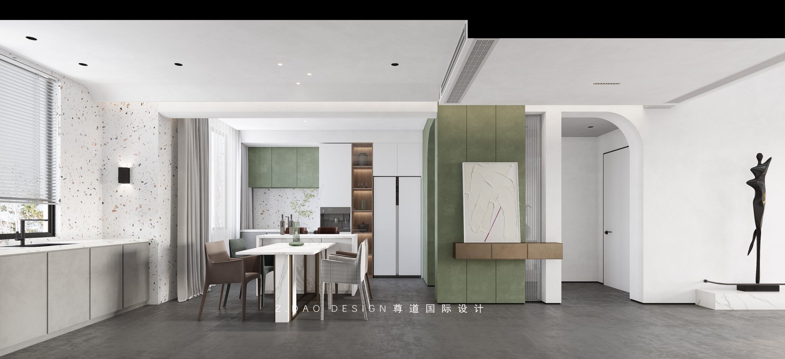 首先,将入户大门方向调整,避免大门冲着楼梯位置,以及大门外朝向公共楼梯道。一层入户即是玄关,横向的不锈钢柜与竖向的艺术涂料装饰画拉伸整个空间的比例,墙面用了三等分的绿色艺术漆,和后面的西厨橱柜相互呼应,使整个空间有了连贯性。