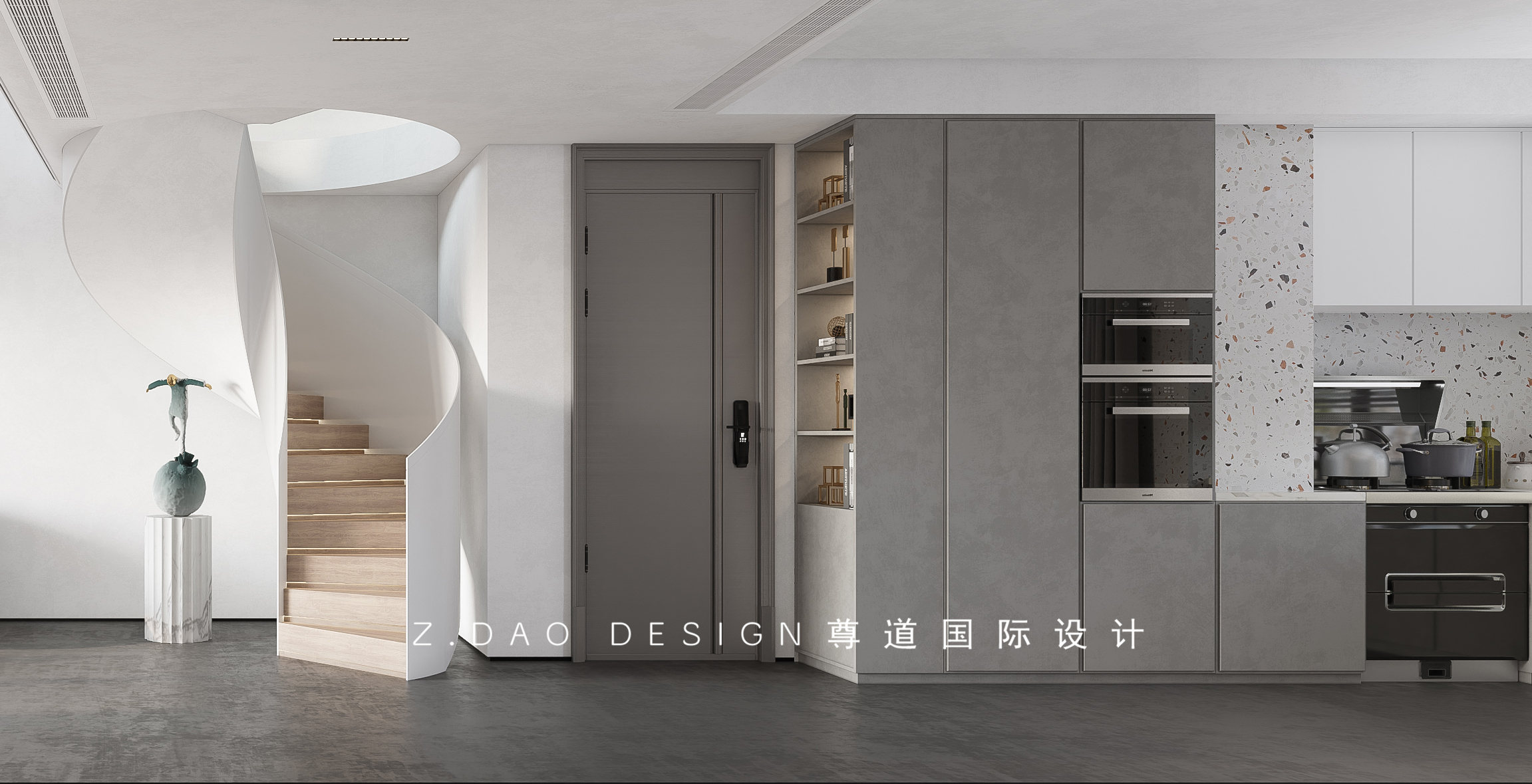 厨餐厅区域,餐厅在国内来说是一个非常重要的区域,因为民以食为天,餐厅就是家里的聚宝盆,这也就是我们为了餐厅更加大气和寓意更好的一个设计思路,西厨的中岛在厨房和餐厅之间,中岛也是一家人可以聊聊天吃吃水果的地方,他是厨房的延伸,是空间的一个延展,也是非常实用的设计,西厨柜子也做到了它最大化的利用,有展示,有储存。